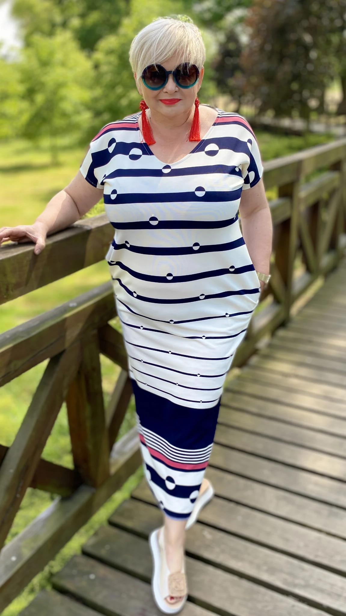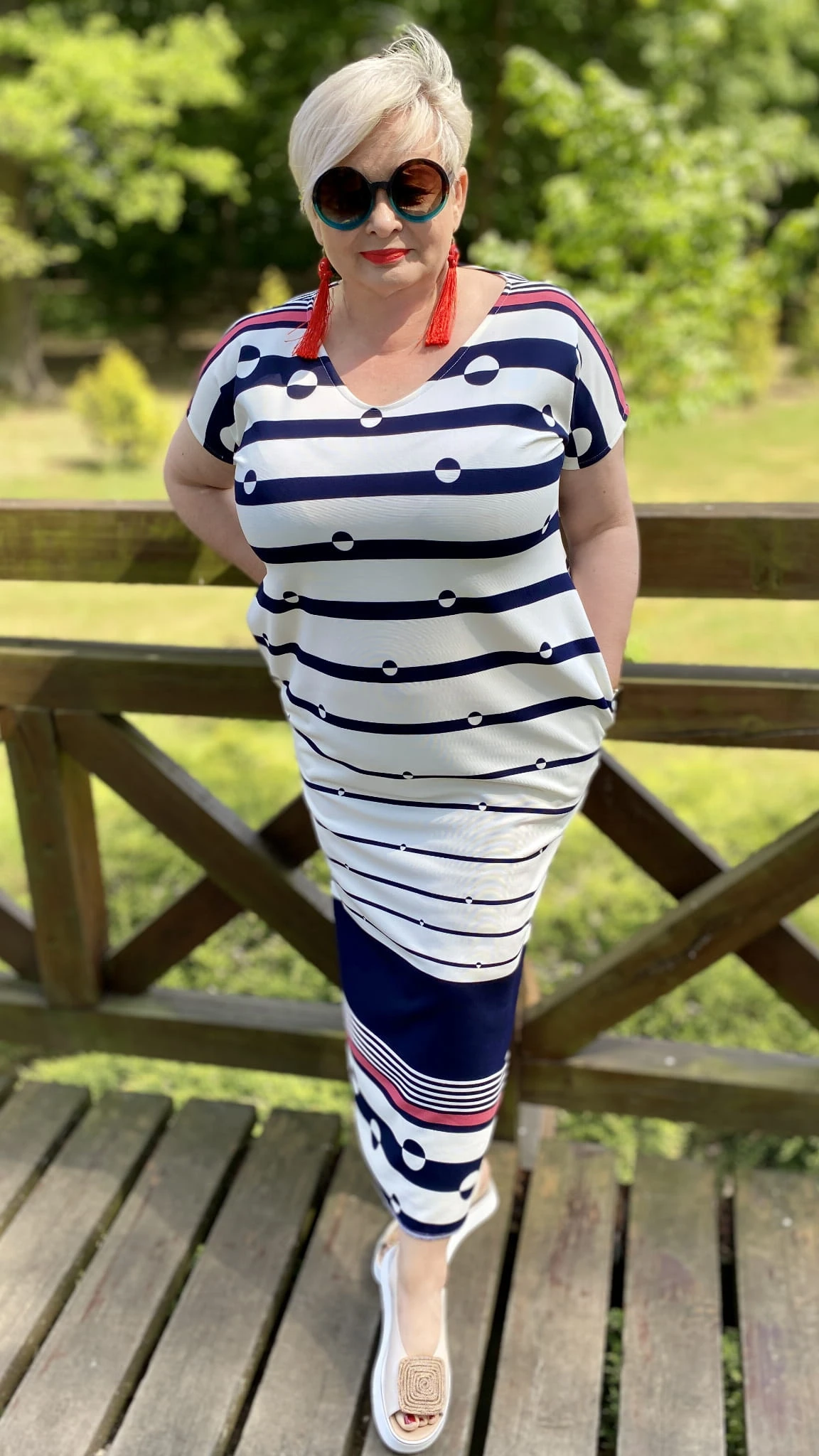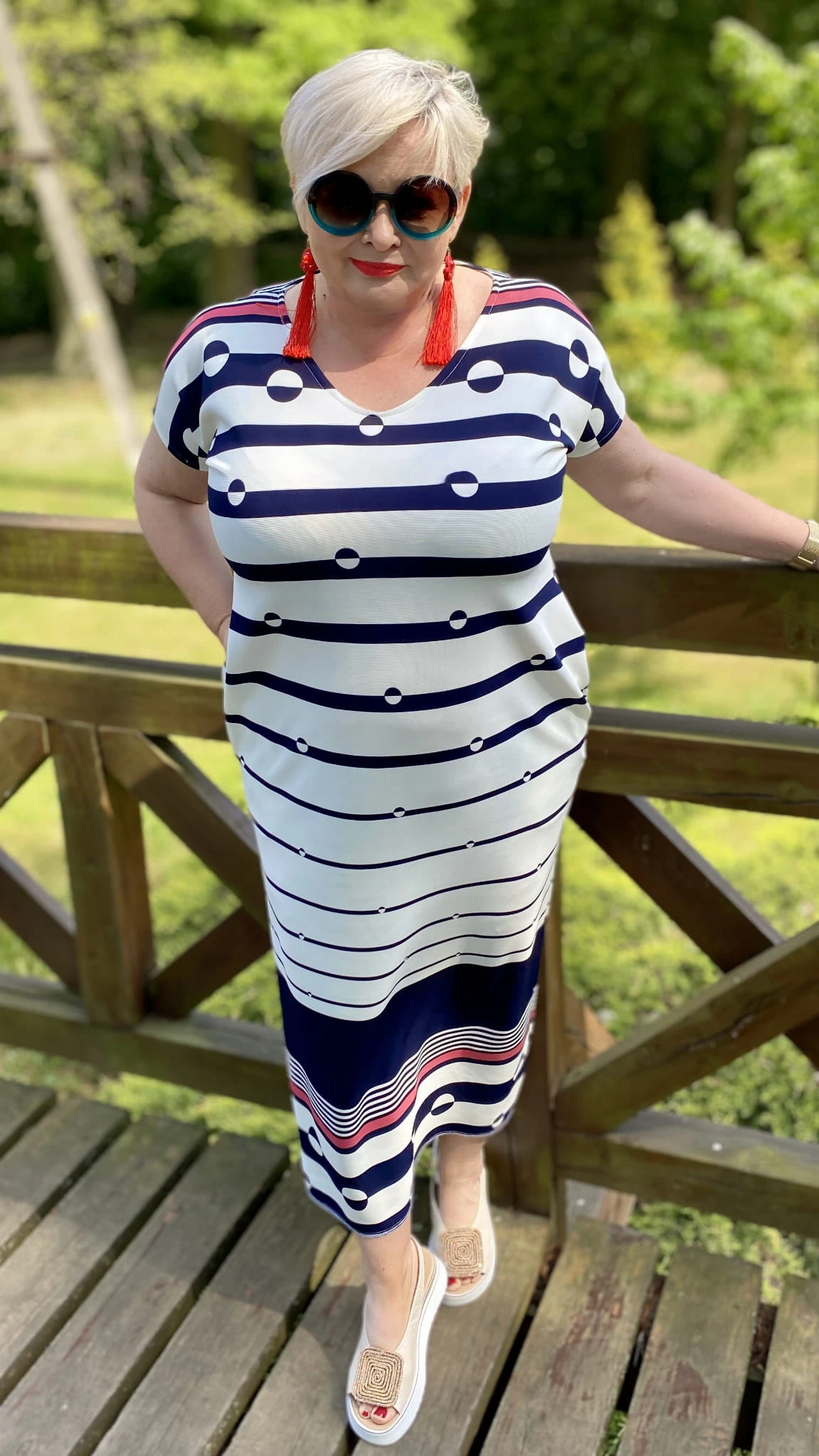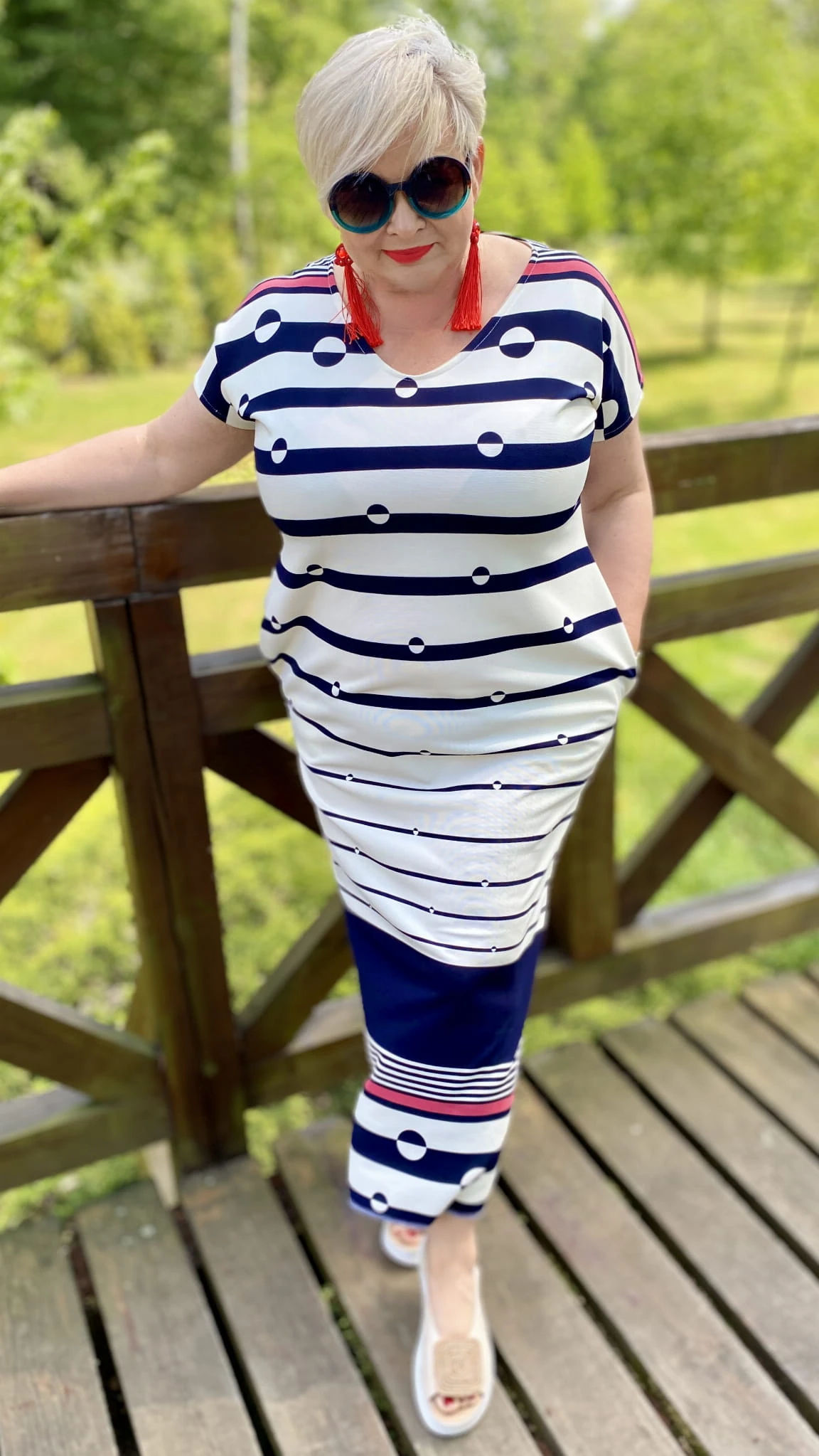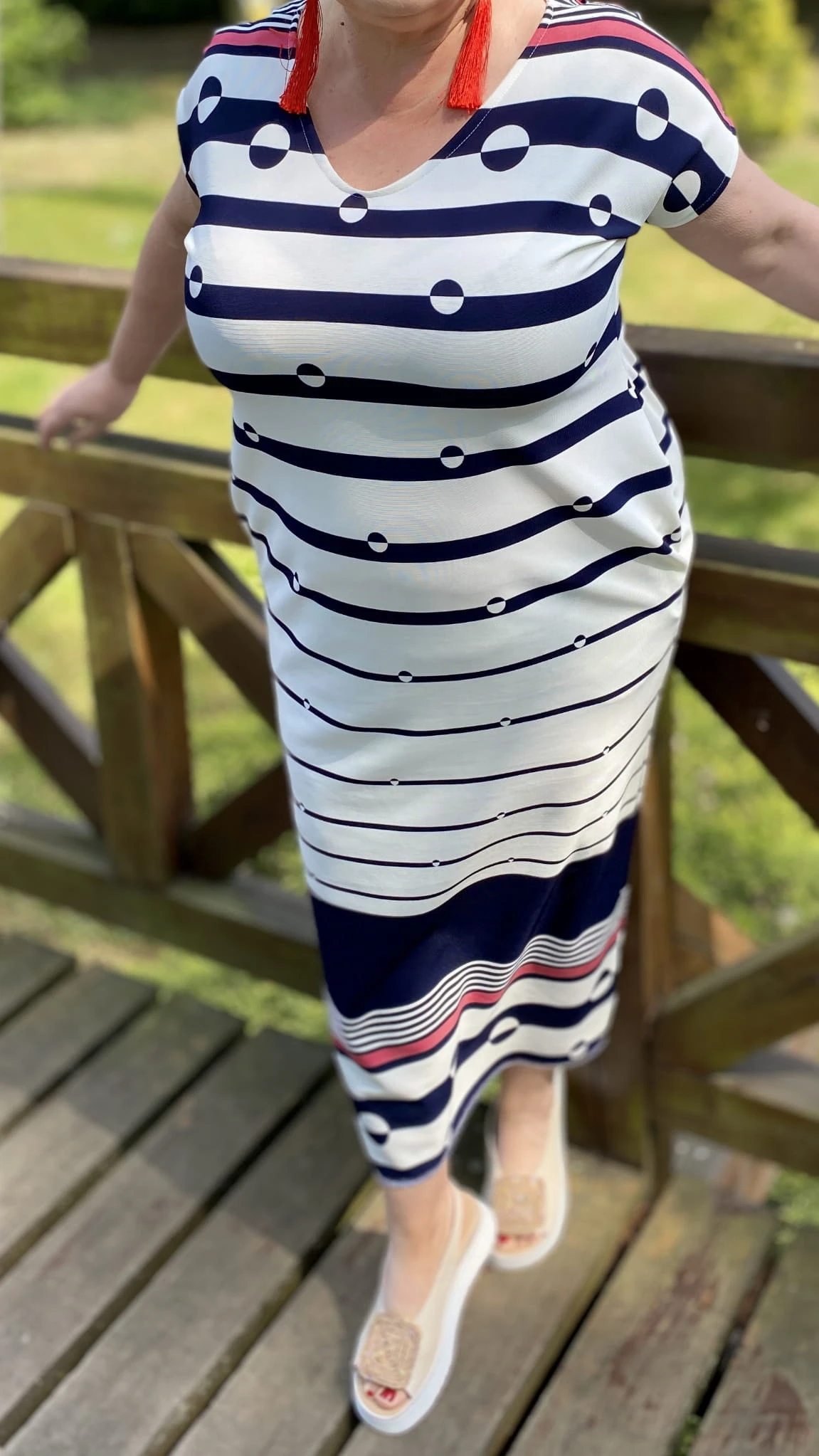 38-40 - Jersey żakardowy wiskozowy lejący duży raport, bez kieszeni, EDYCJA LIMITOWANA, biust 110/112 cm, sukienka elastyczna, prosta z kieszeniami, MODA POLSKA - BIAŁA W GRANATOWE PASY I KÓŁKA