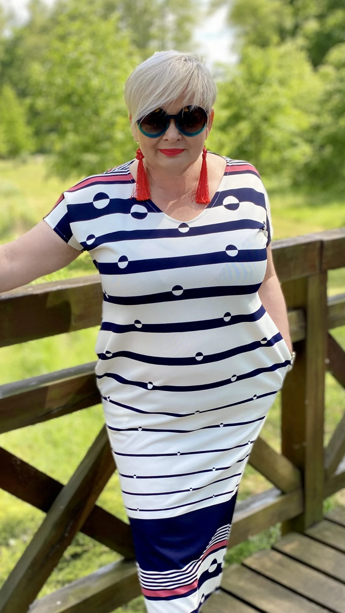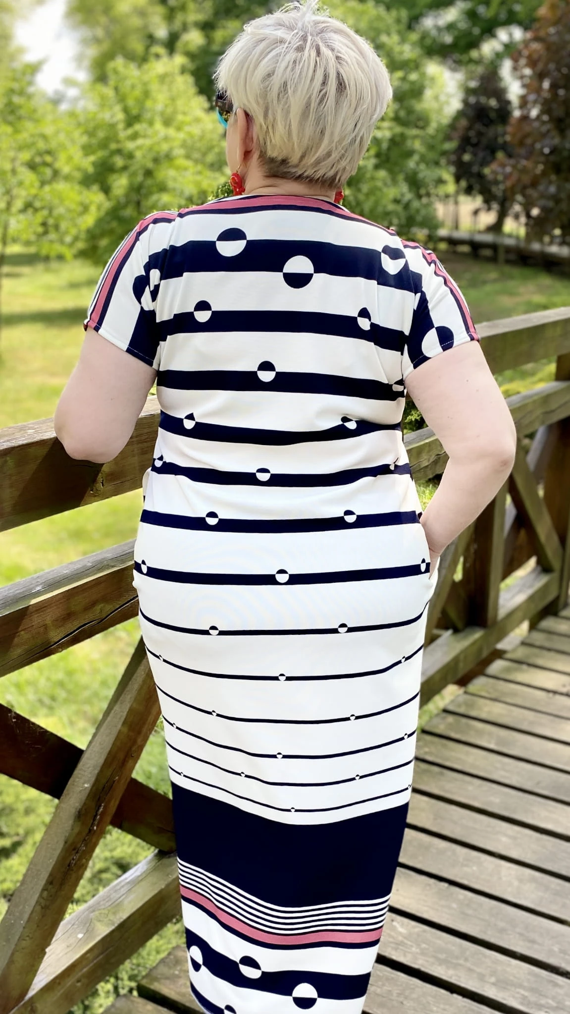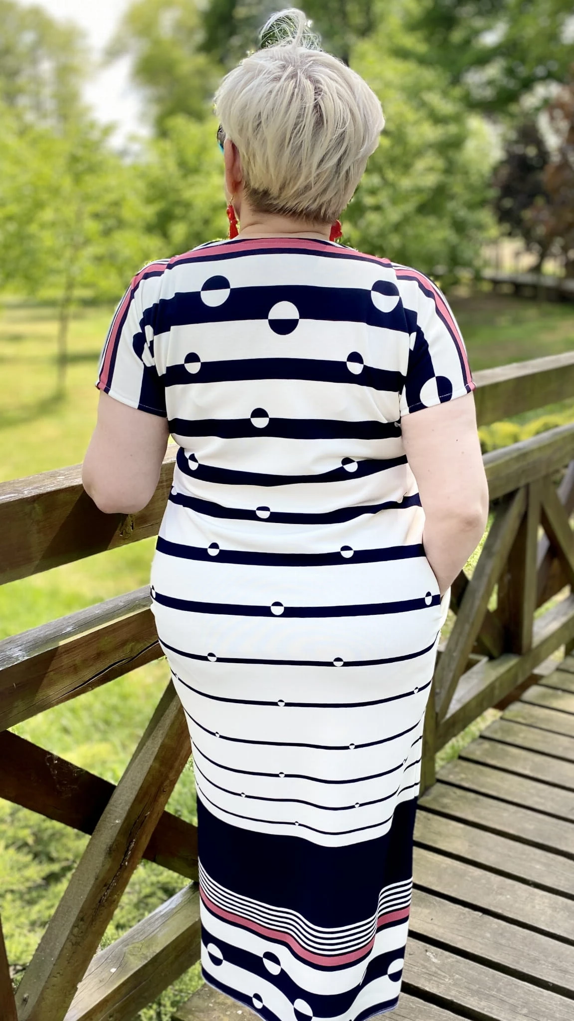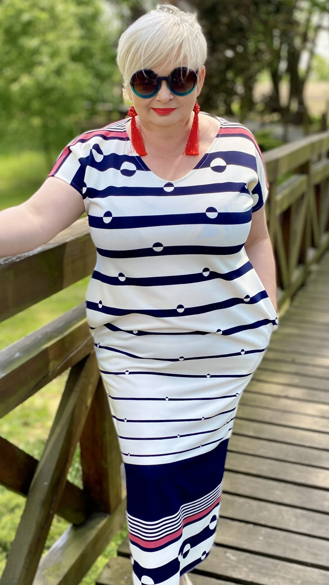 38-40 - Jersey żakardowy wiskozowy lejący duży raport, bez kieszeni, EDYCJA LIMITOWANA, biust 110/112 cm, sukienka elastyczna, prosta z kieszeniami, MODA POLSKA - BIAŁA W GRANATOWE PASY I KÓŁKA
