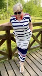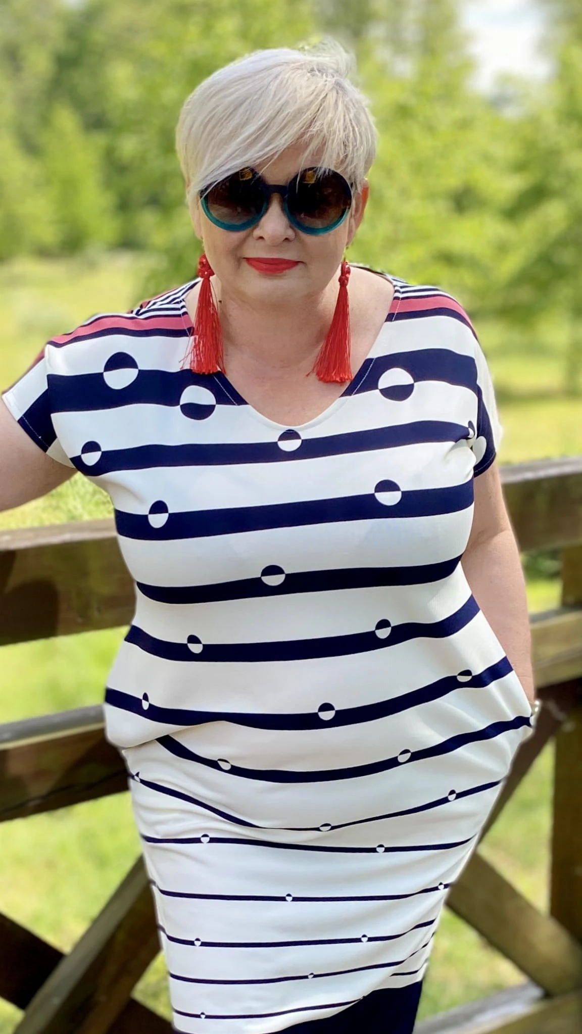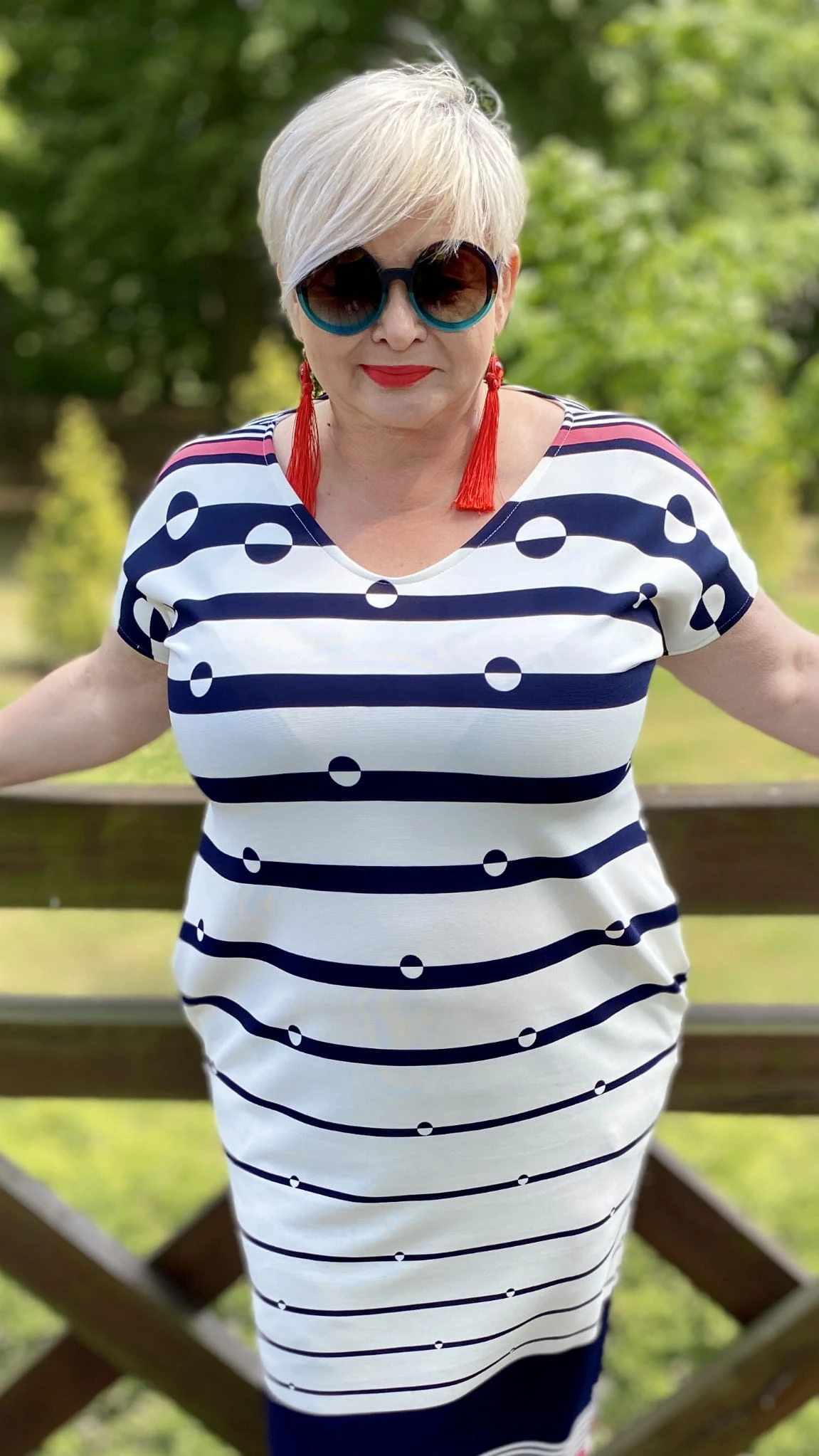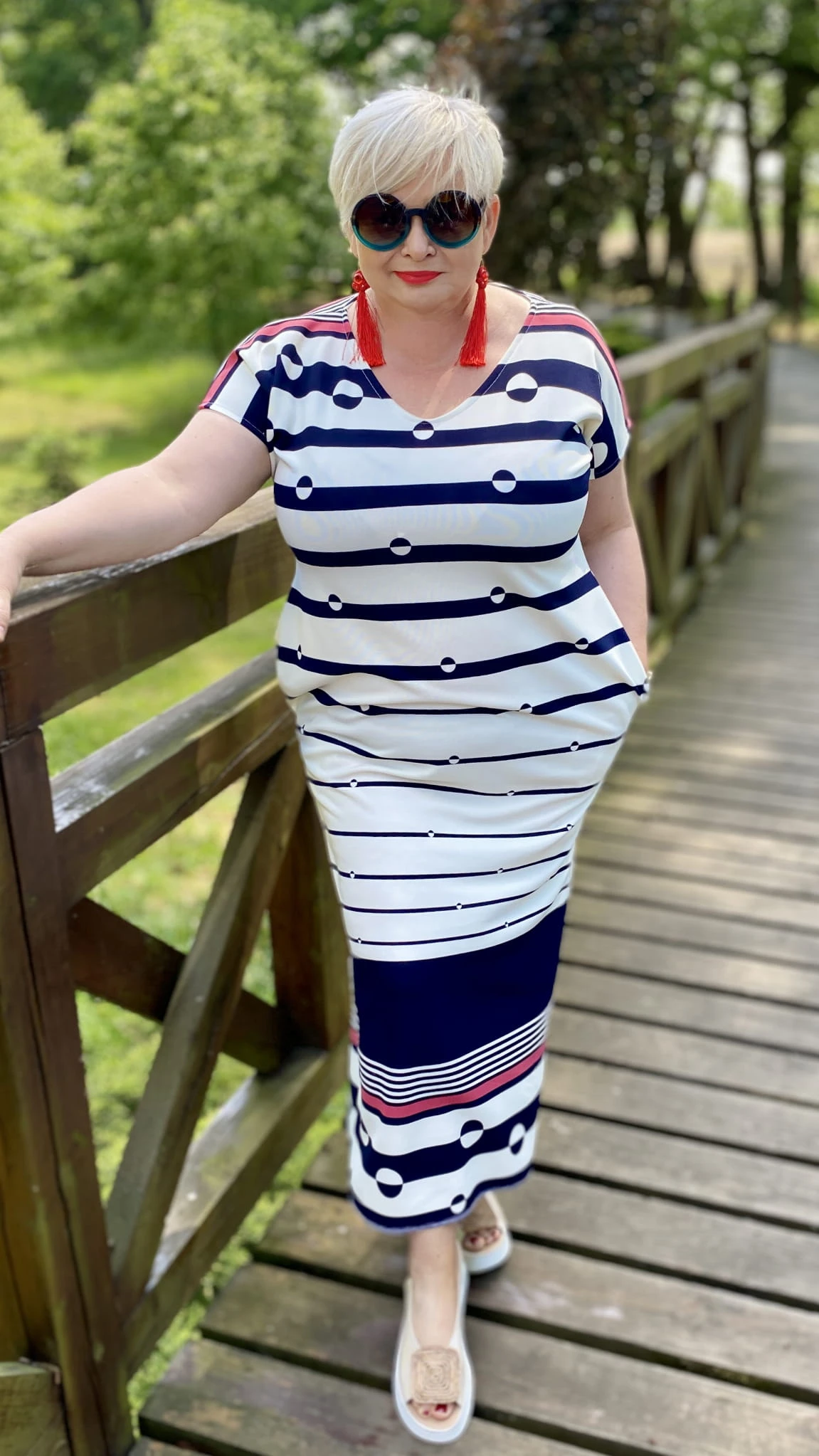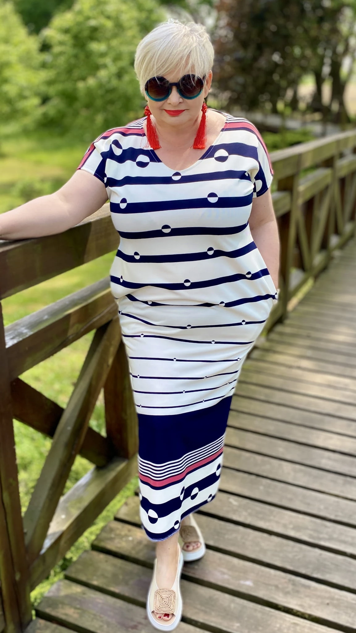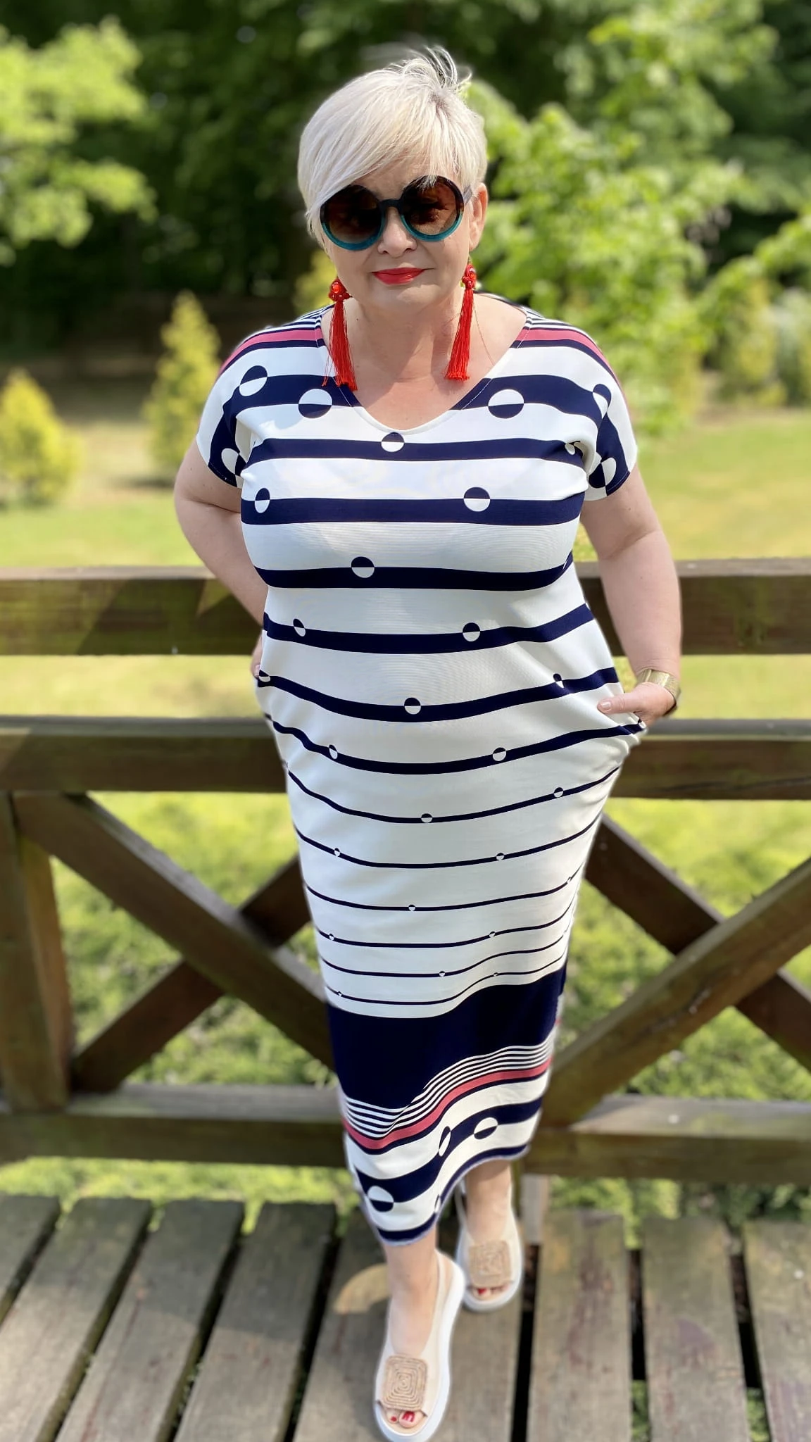38-40 - Jersey żakardowy wiskozowy lejący duży raport, bez kieszeni, EDYCJA LIMITOWANA, biust 110/112 cm, sukienka elastyczna, prosta z kieszeniami, MODA POLSKA - BIAŁA W GRANATOWE PASY I KÓŁKA