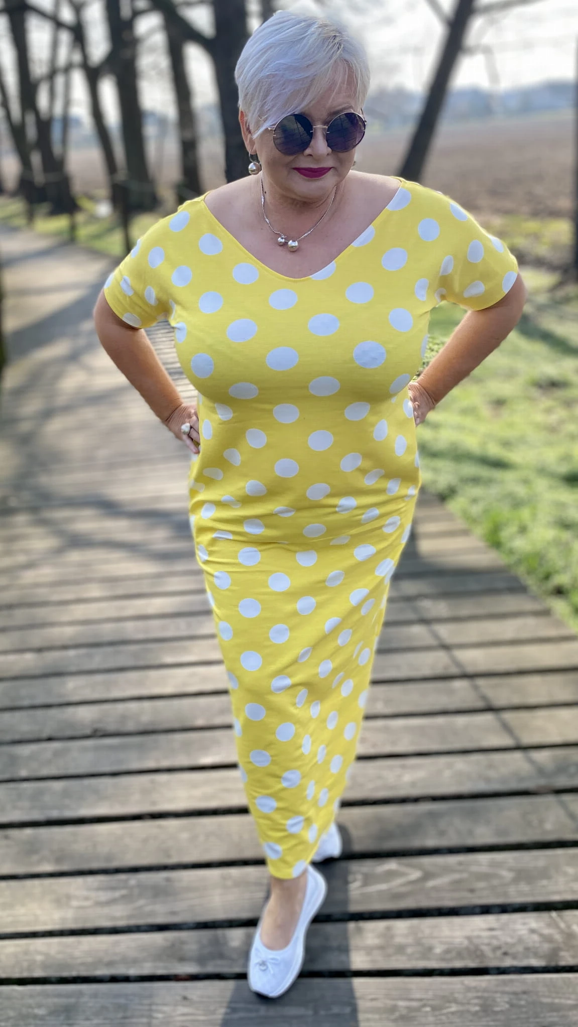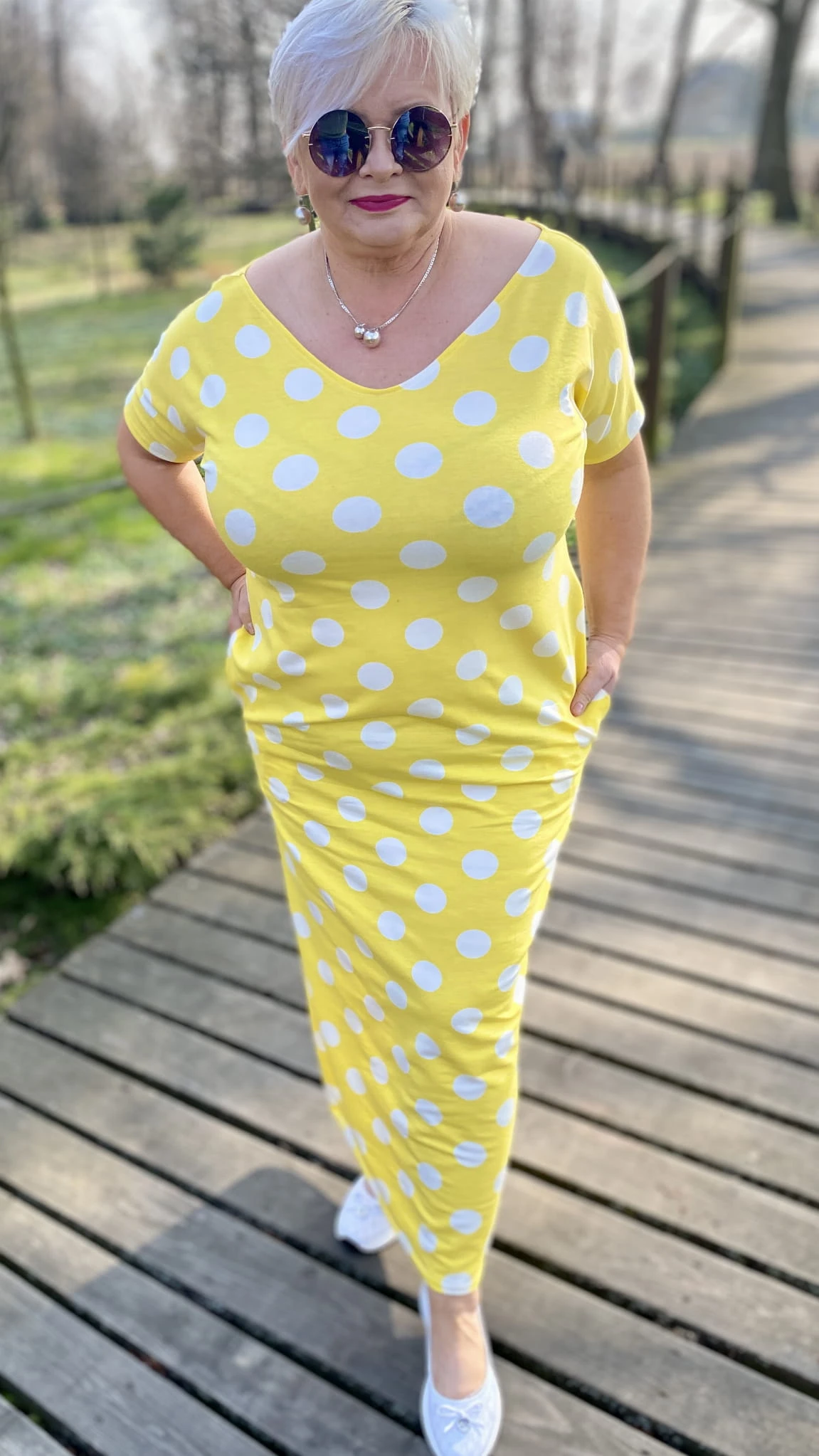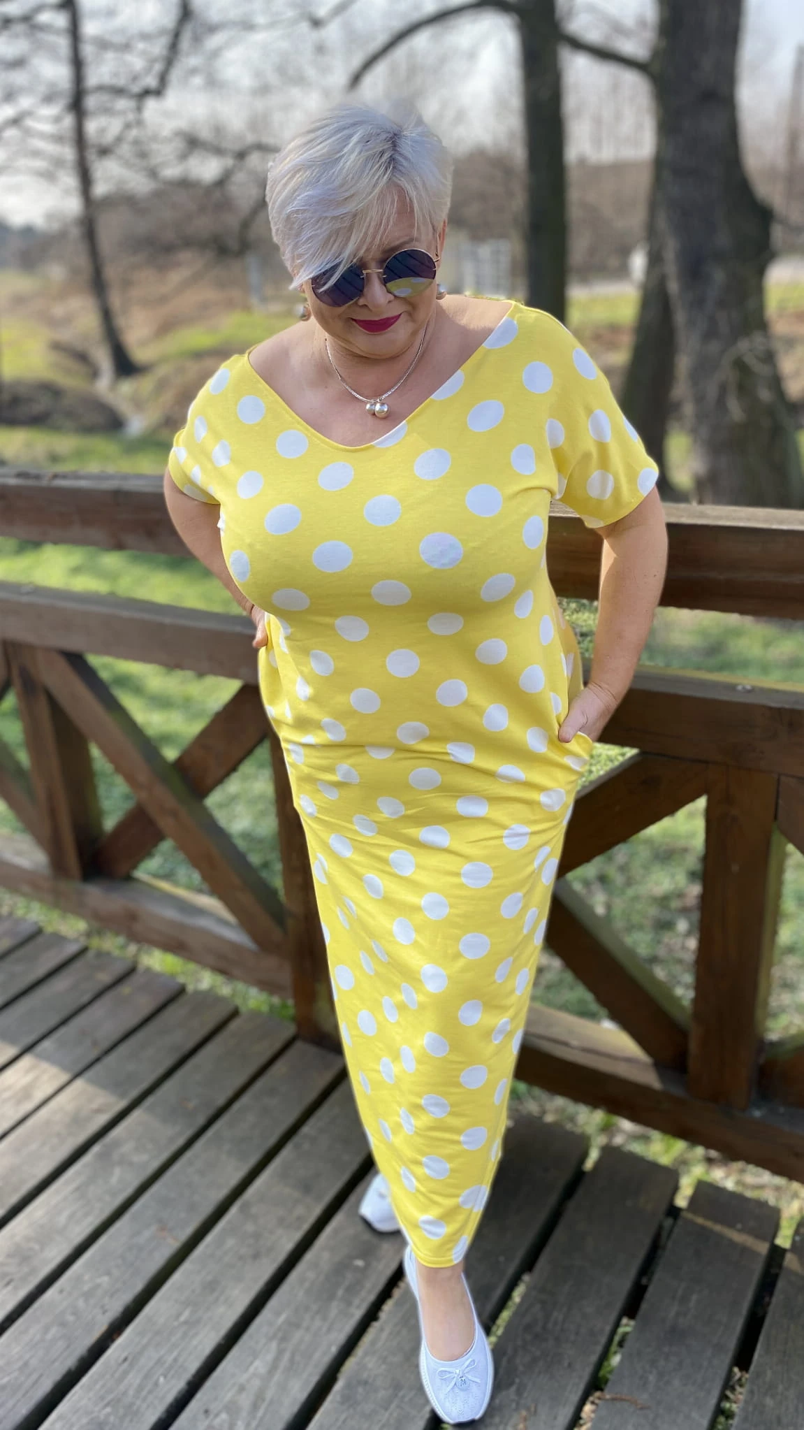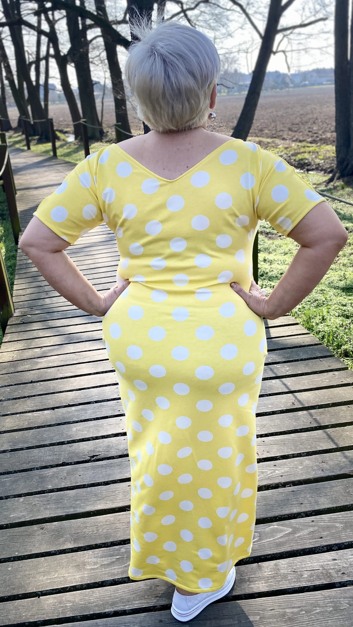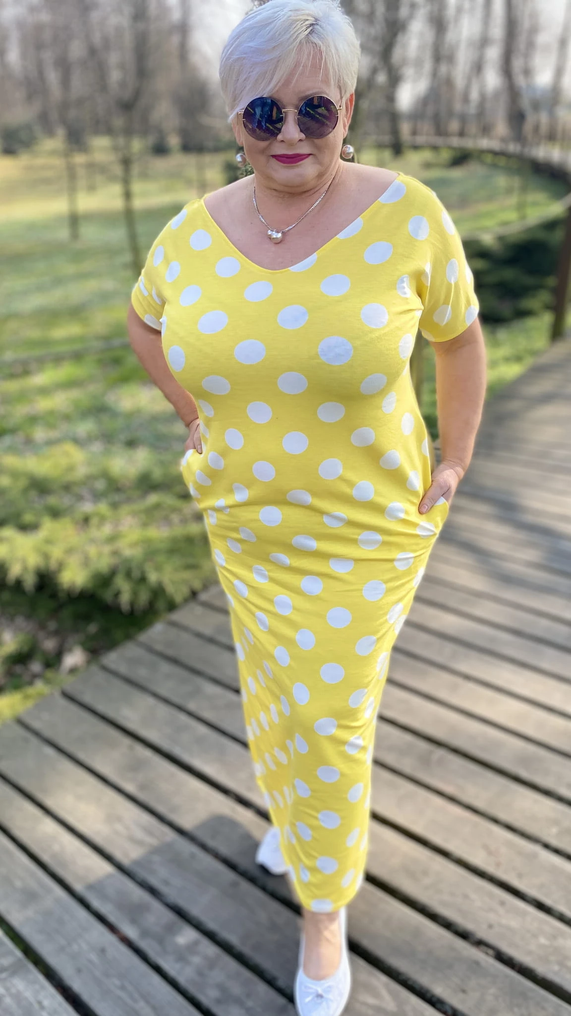 Sukienka 38/40 biust 110/112 cm, WISKOZA Z ELASTANEM, długa, prosta, z kieszeniami, wygodna na wiosnę i lato, ŻÓŁTA W BIAŁE GROCHY