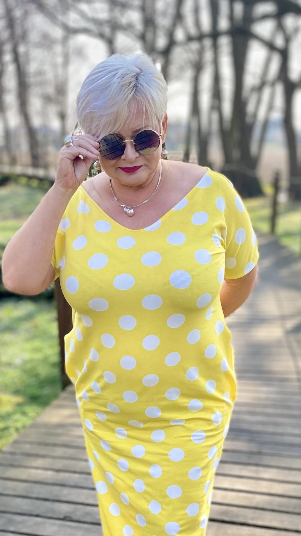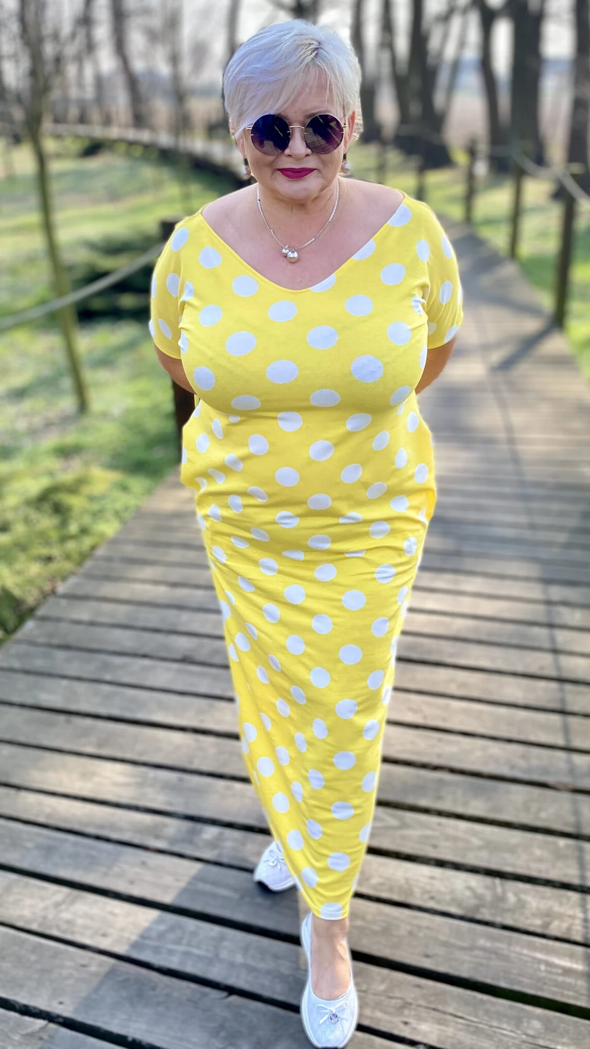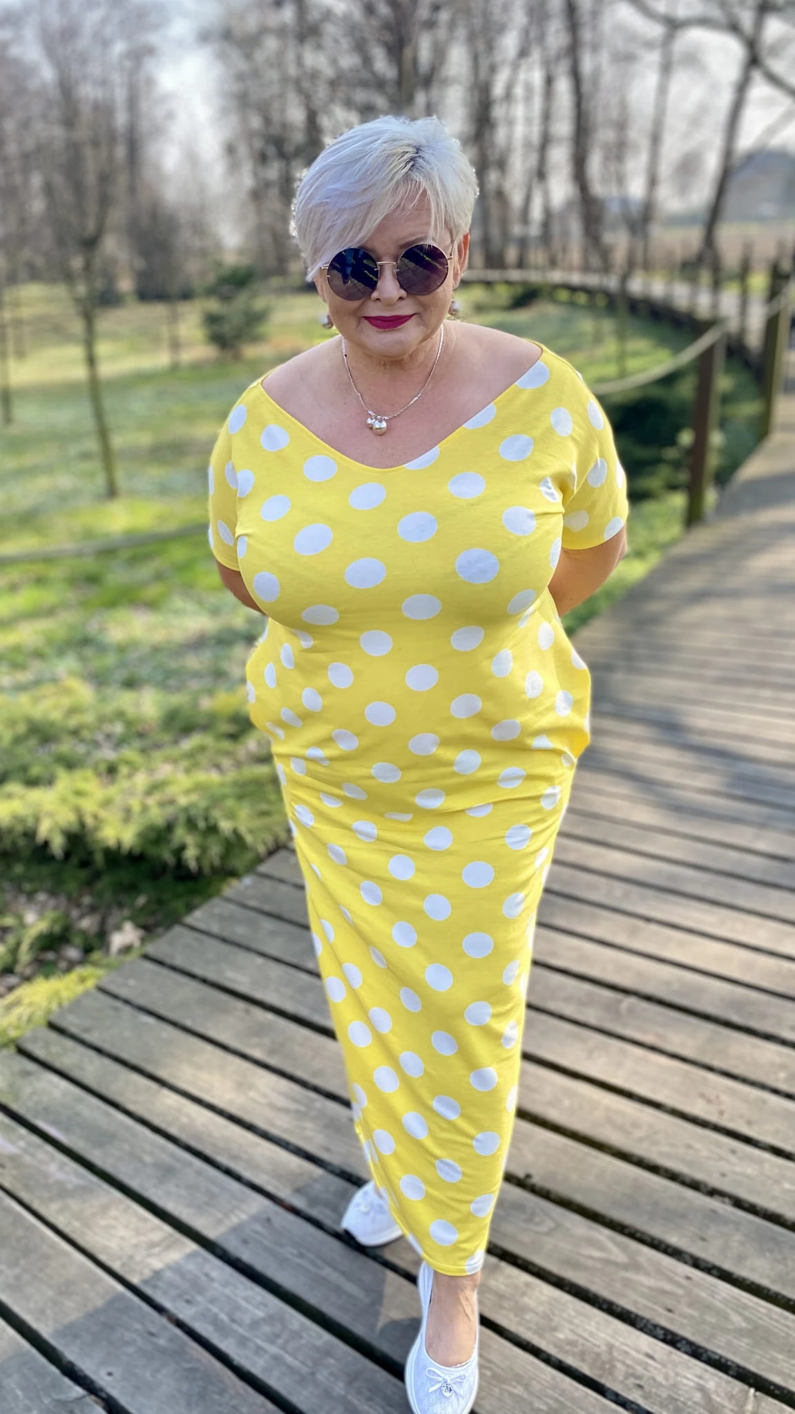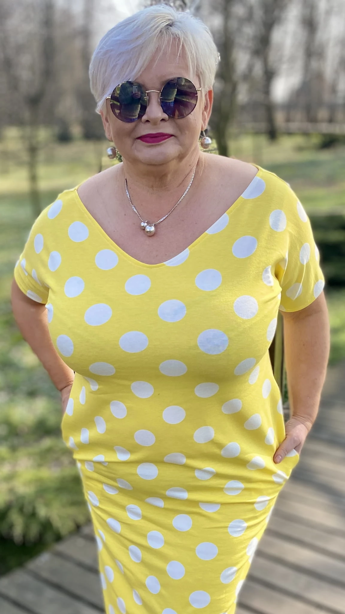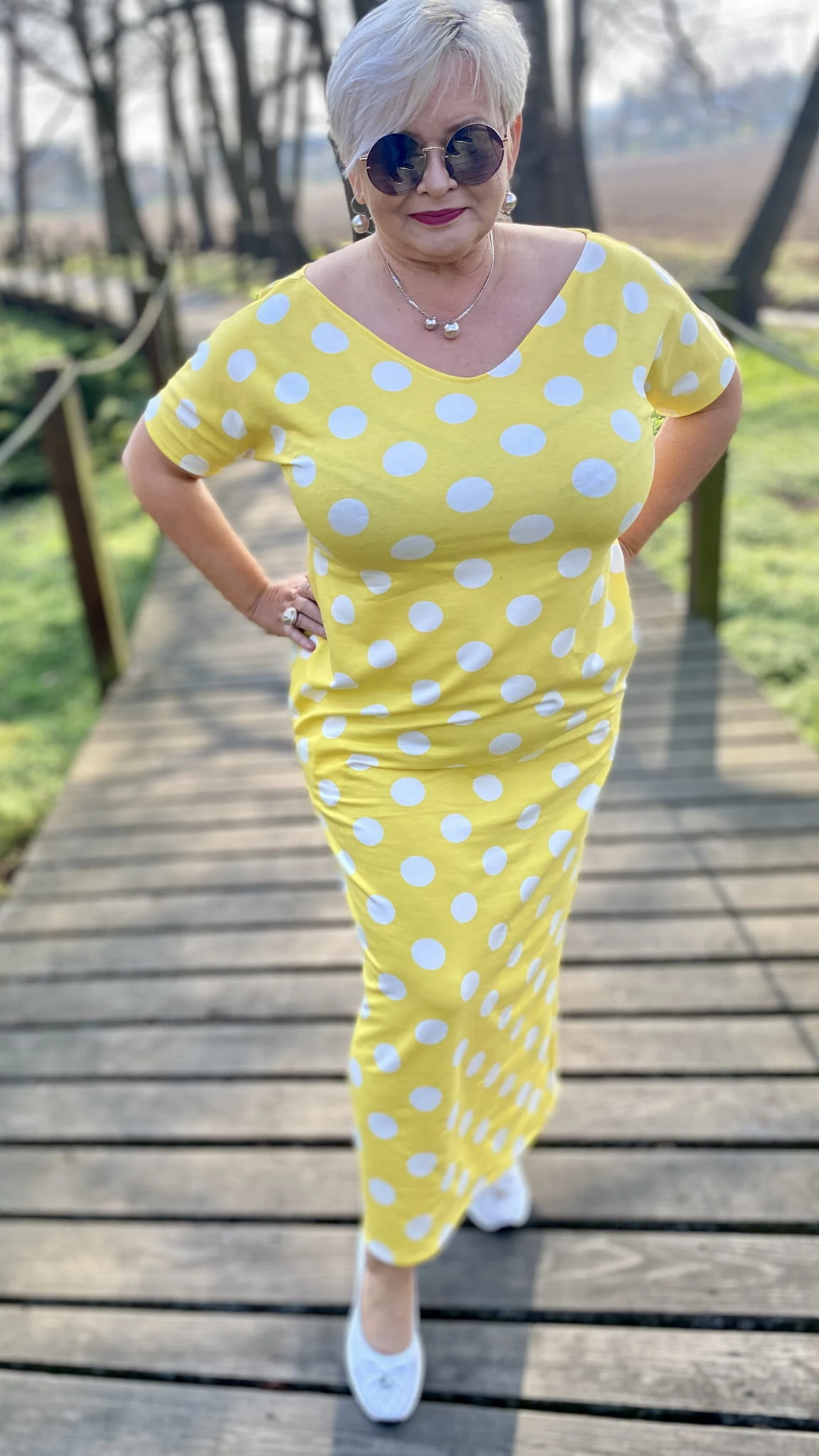 Sukienka 38/40 biust 110/112 cm, WISKOZA Z ELASTANEM, długa, prosta, z kieszeniami, wygodna na wiosnę i lato, ŻÓŁTA W BIAŁE GROCHY