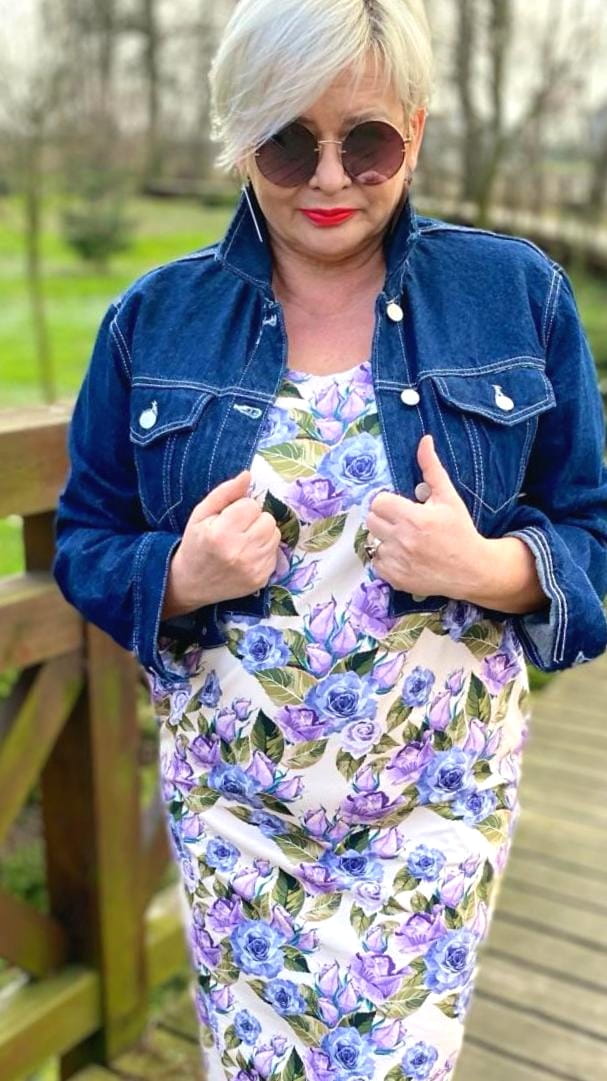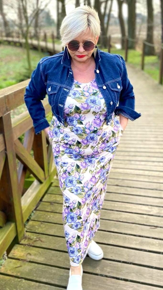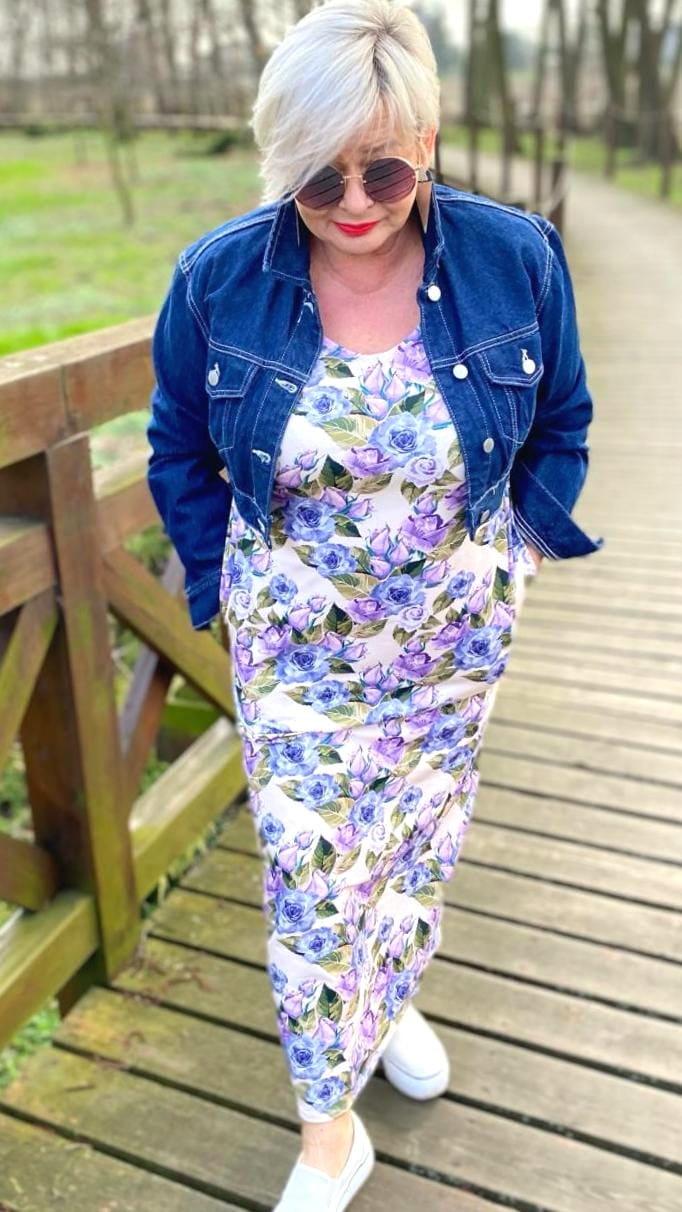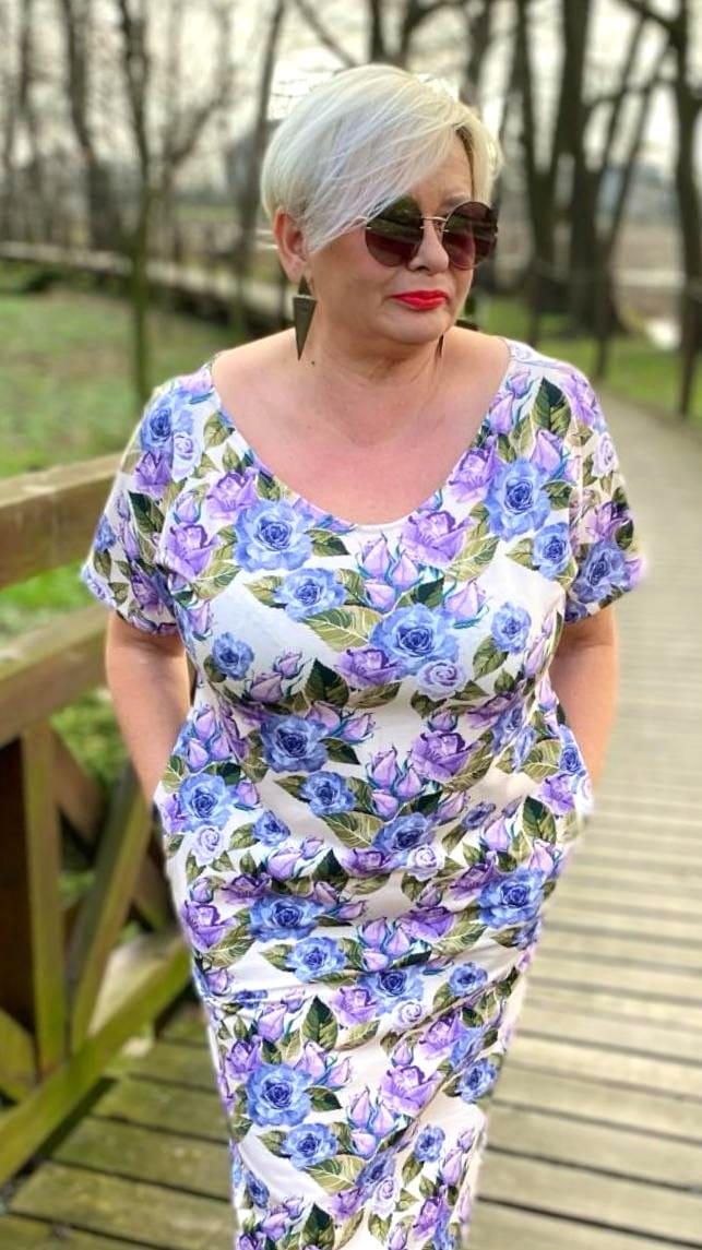 Sukienka 40/42, biust 112/114 cm, z bawełny, elastyczna, naturalna, wygodna, z kieszeniami, pogłębiony dekolt z przodu i tyłu, W KWIATY, RÓŻE, KREMOWA