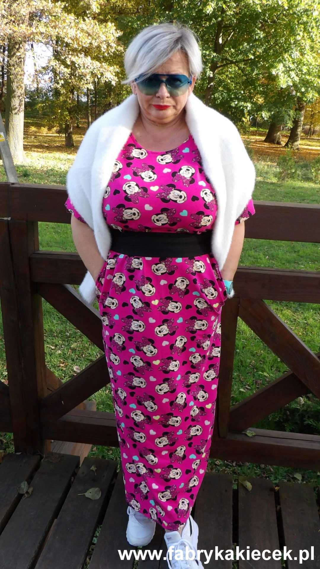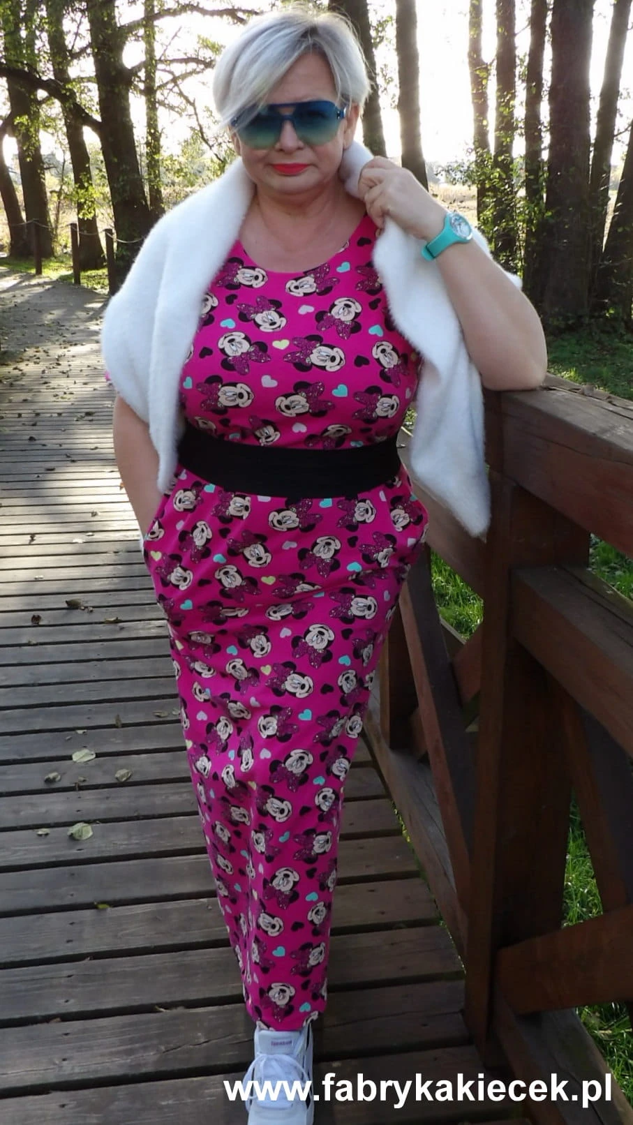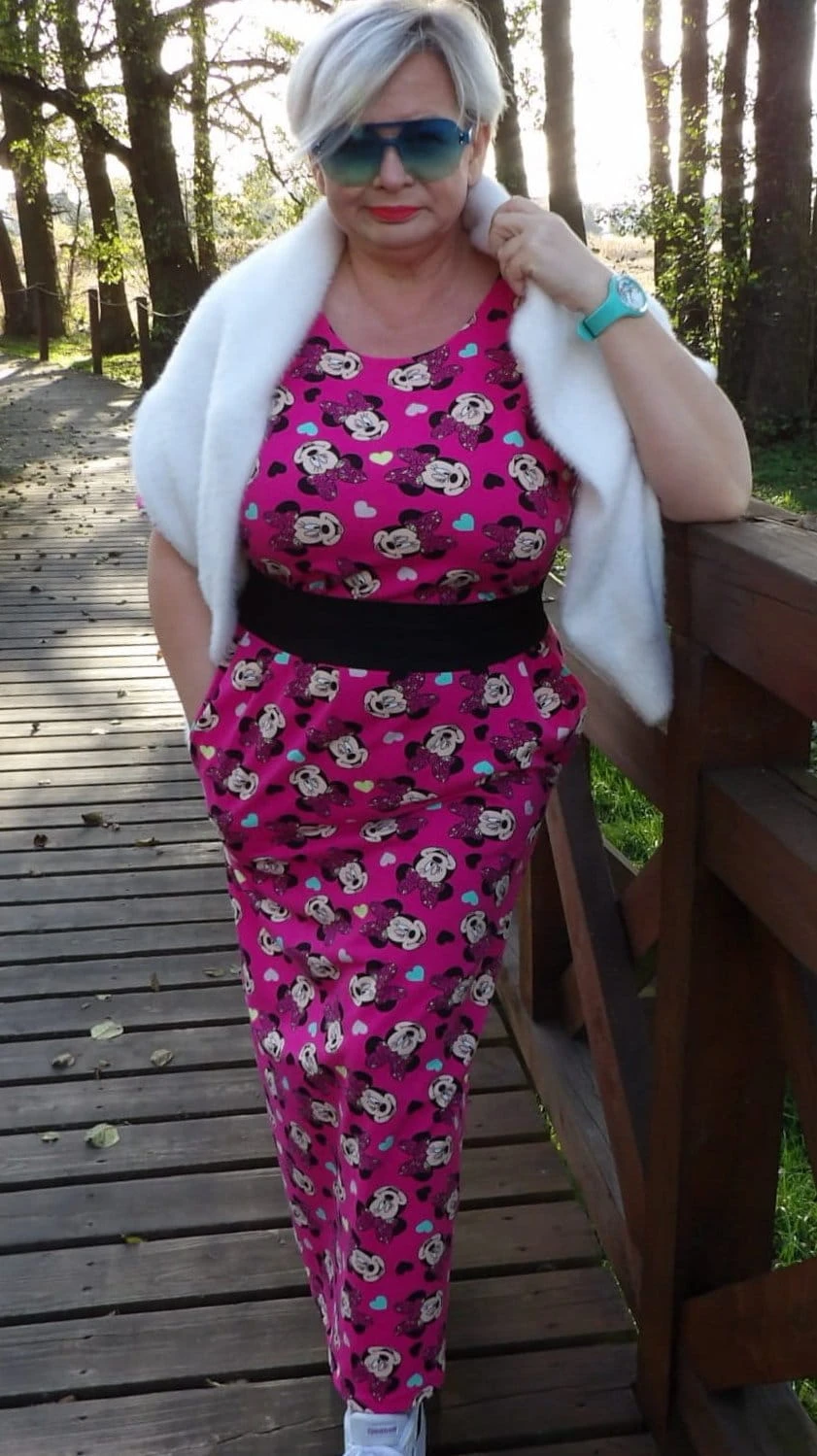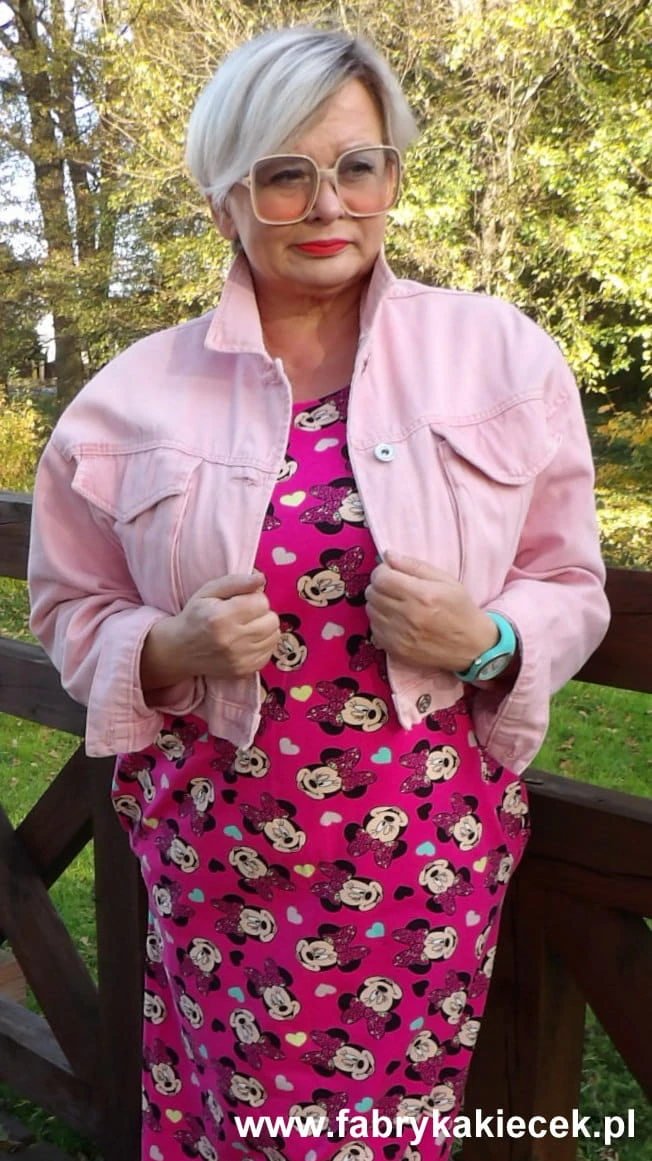 Sukienka 40/42 biust 112/114 cm, z elastycznej bawełny, naturalna, prosta, z kieszeniami, RÓŻOWA, BAJKOWA, MYSZKA
