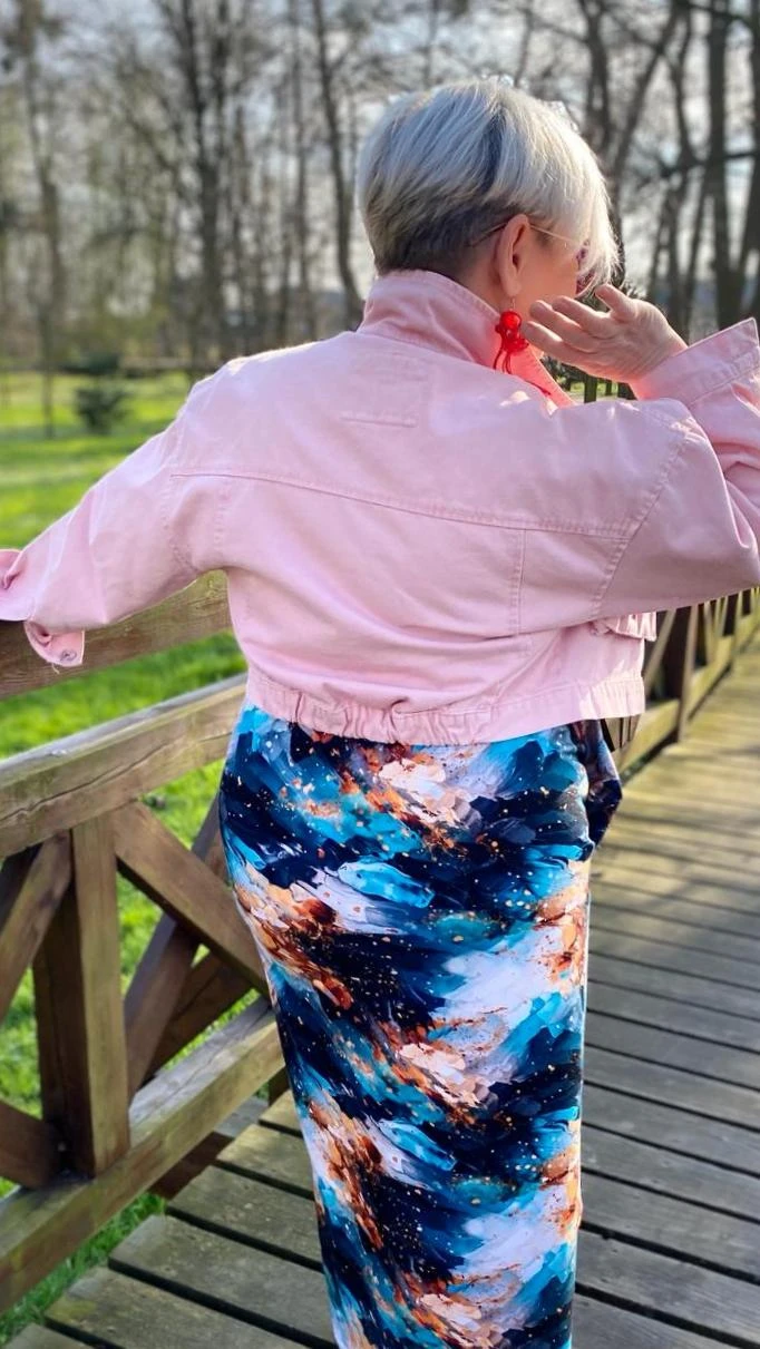 Z uwagi, że jest długa - dołem dla utrzymania fasonu i nadania lekkości sylwetce jest nieco zwężana, ma wpuszczane niewidoczne kieszenie.