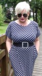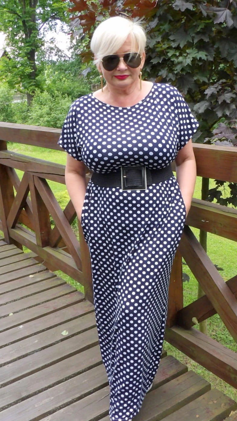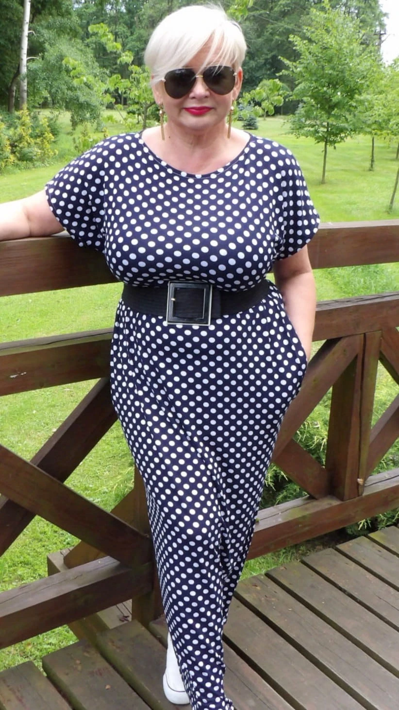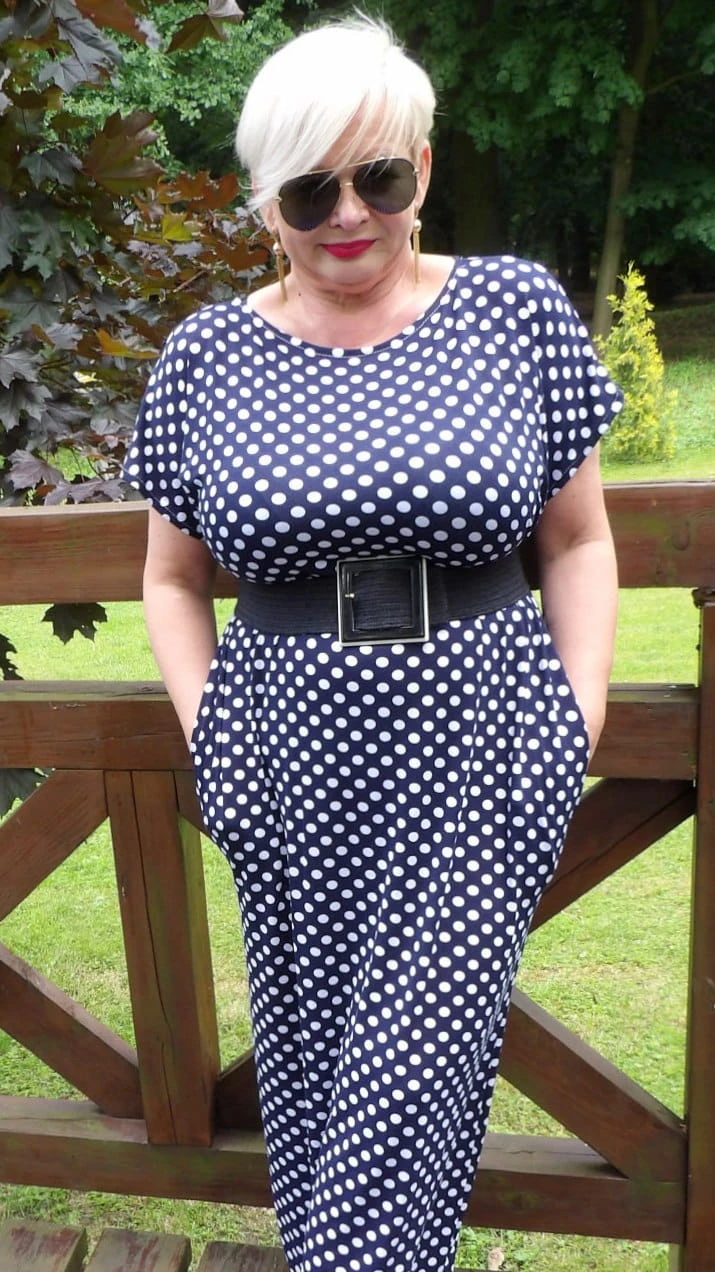 Sukienka 42/44 biust 116/118 cm, bawełniana dzianina elastyczna, naturalna , na duży biust, BIAŁE GROCHY, GRANATOWA