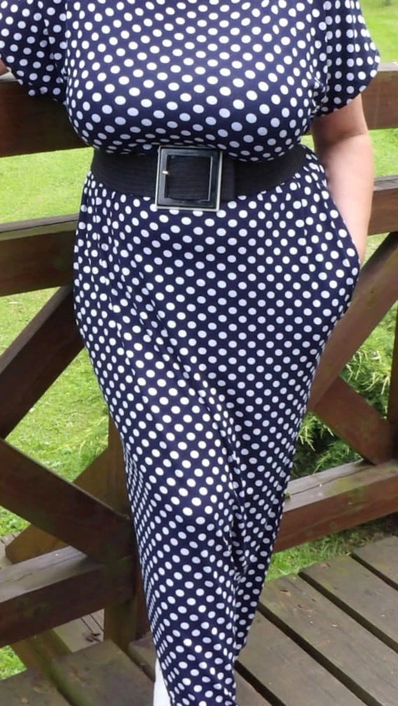 Sukienka 44/46 biust 118/120 cm, bawełniana dzianina elastyczna, naturalna , na duży biust, BIAŁE GROCHY, GRANATOWA