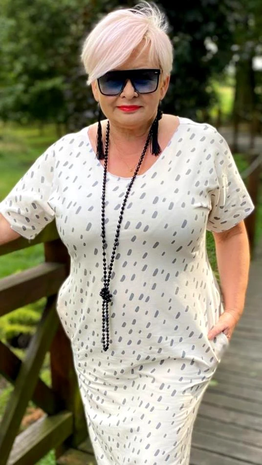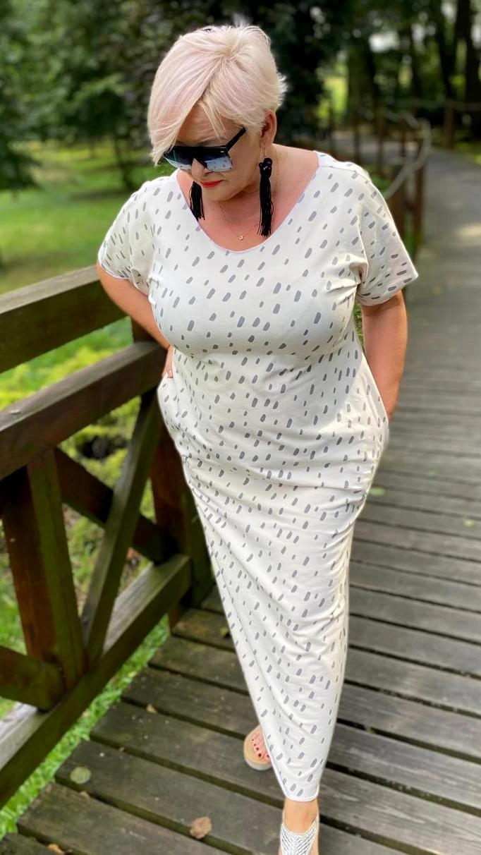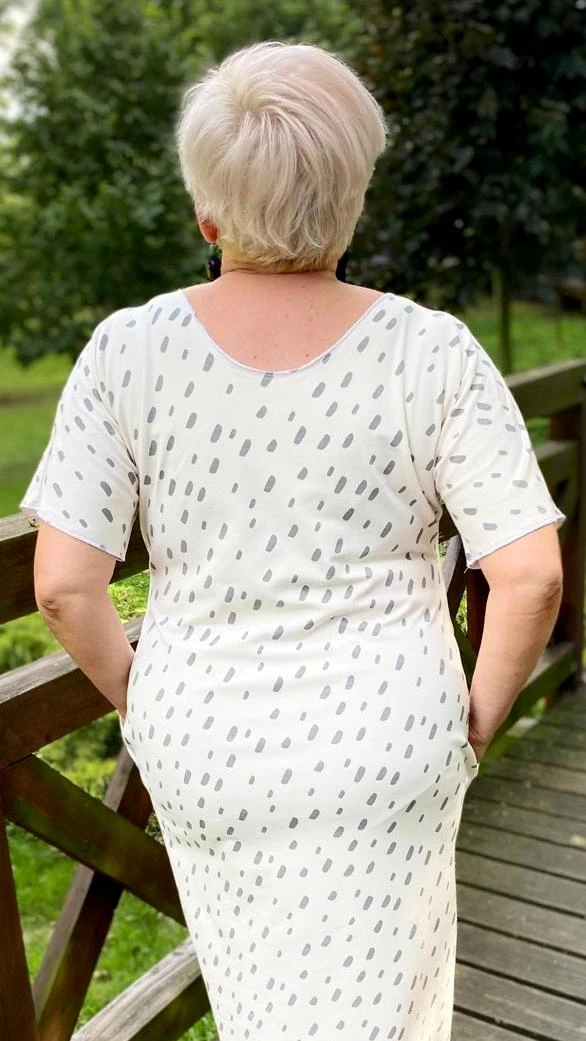 Sukienka 44/46 biust 118/120 cm plus size, na duży biust, wygodna, naturalna, całoroczna, elastyczna, bawełniana, z kieszeniami, KREMOWA, SZARE KROPLE