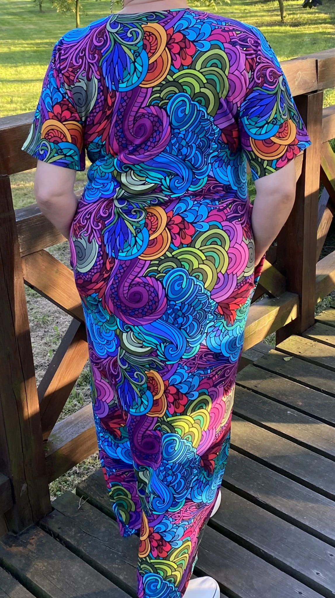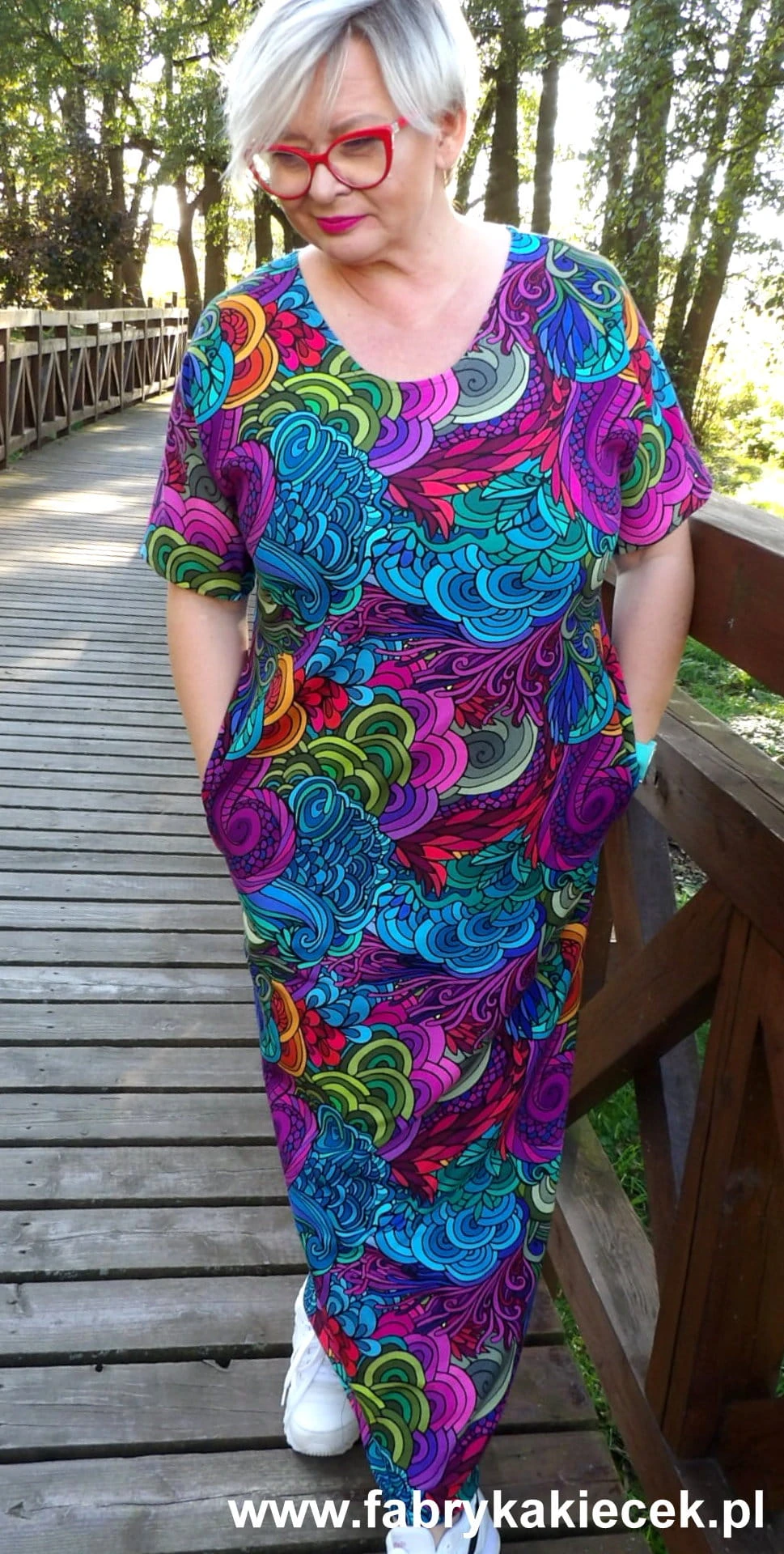 Sukienka 46/48 biust 118/120 cm, naturalna, na duży biust, plus size, wygodna, z elastycznej bawełny, fioletowa, różowa, KOLOROWE FALE