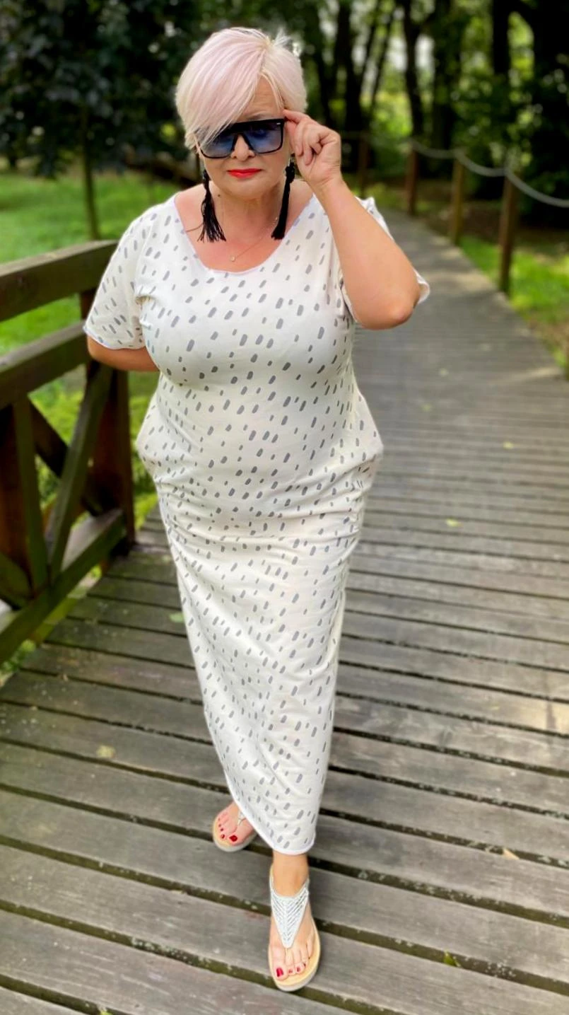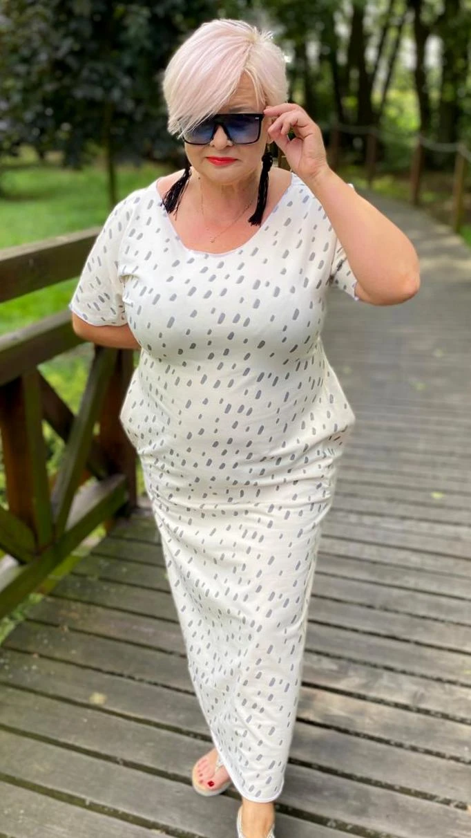Sukienka 46/48 biust 120/122 cm plus size, na duży biust, wygodna, naturalna, całoroczna, elastyczna, bawełniana, z kieszeniami, KROPLE NA KREMOWYM TLE