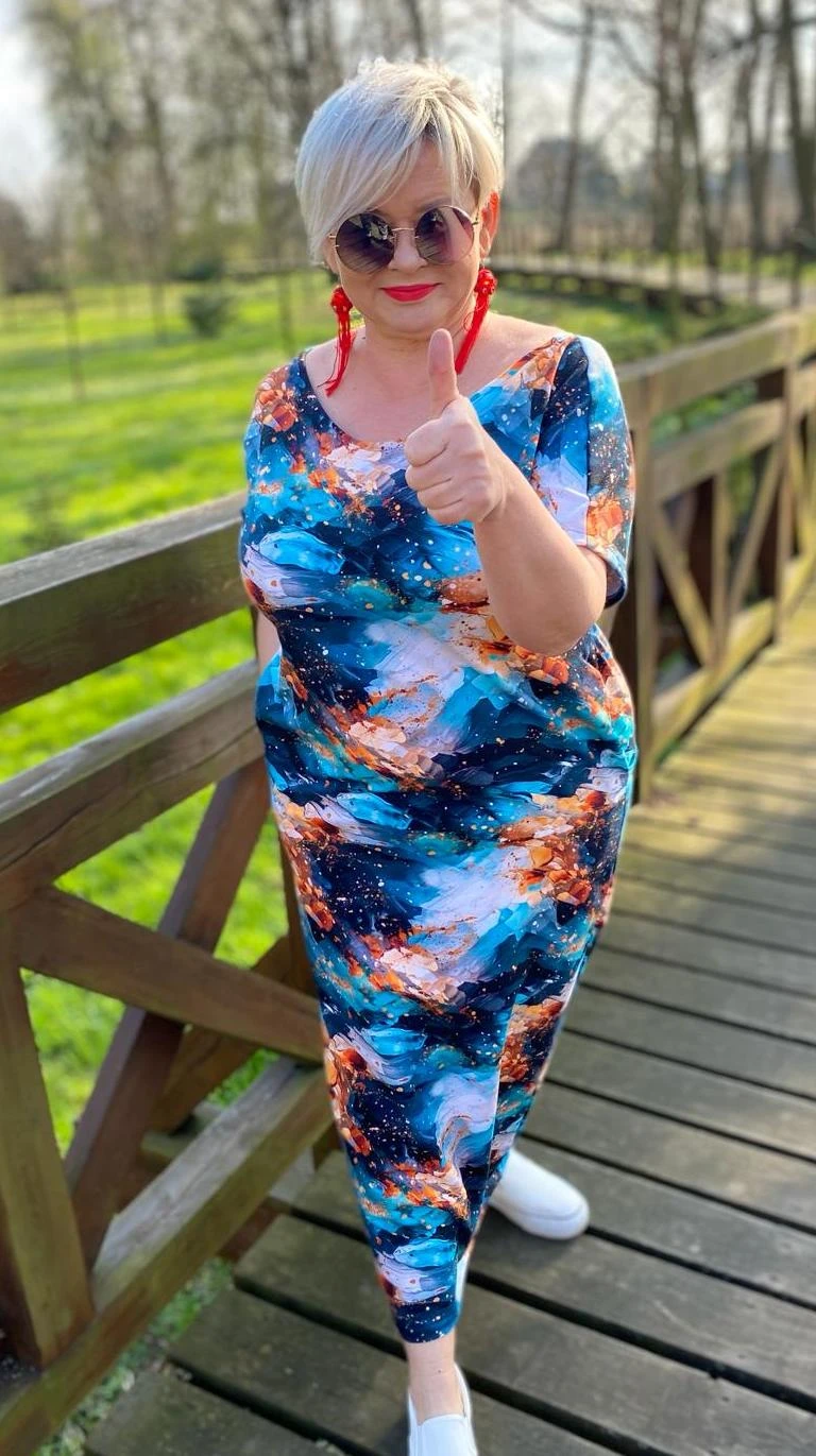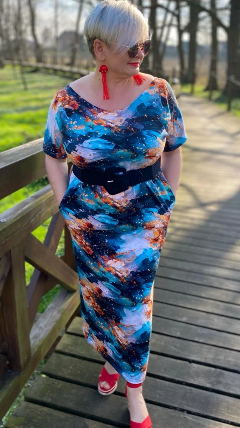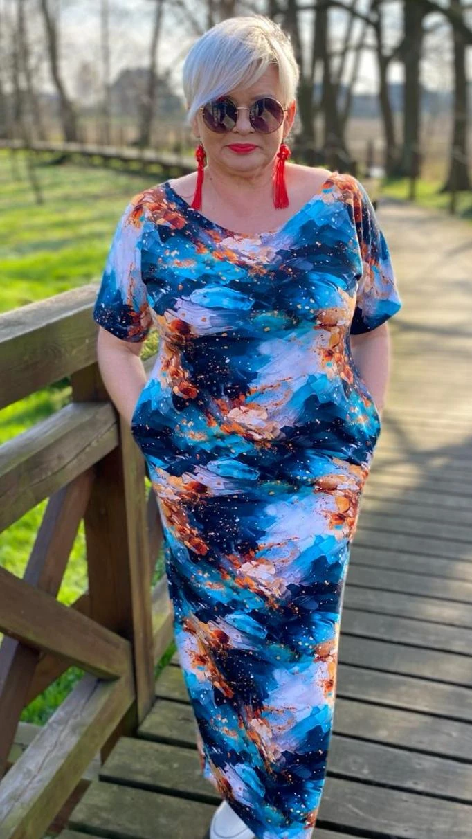 Sukienka 48/50 biust 122/124 cm, bawełniana, elastyczna, z kieszeniami, rozlana farba