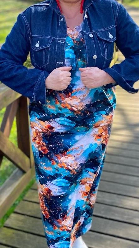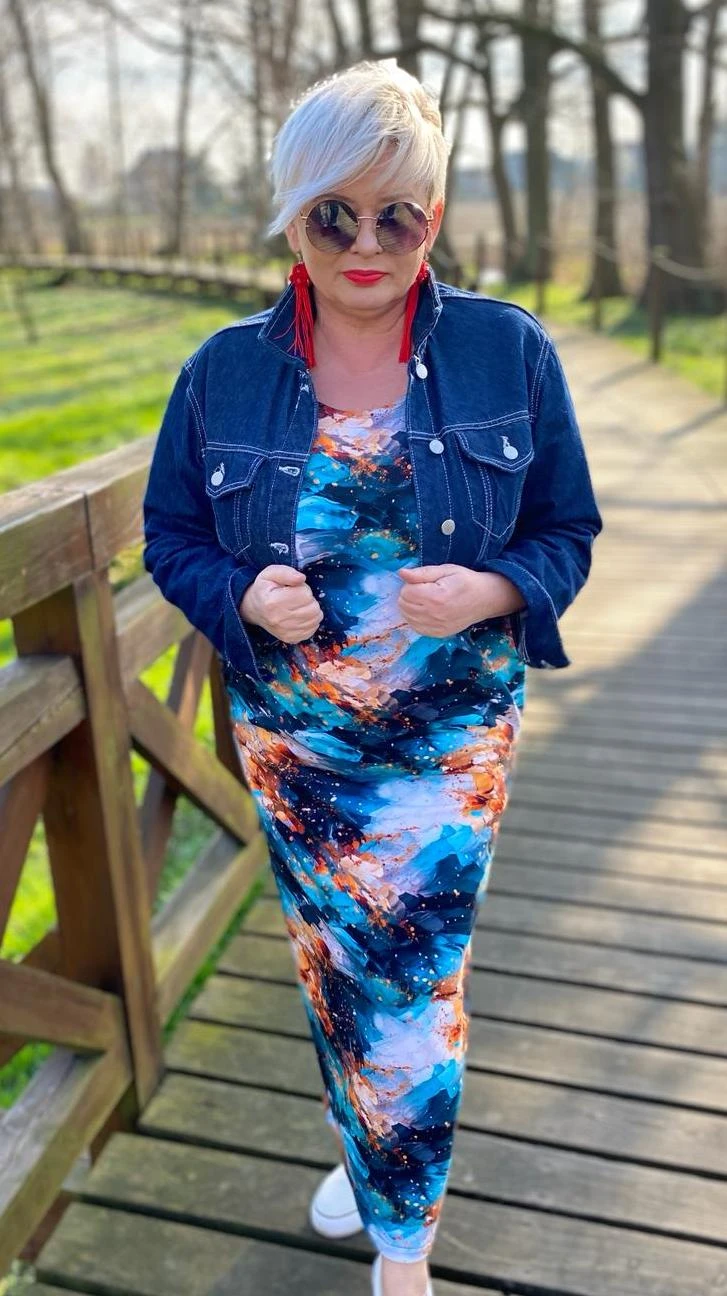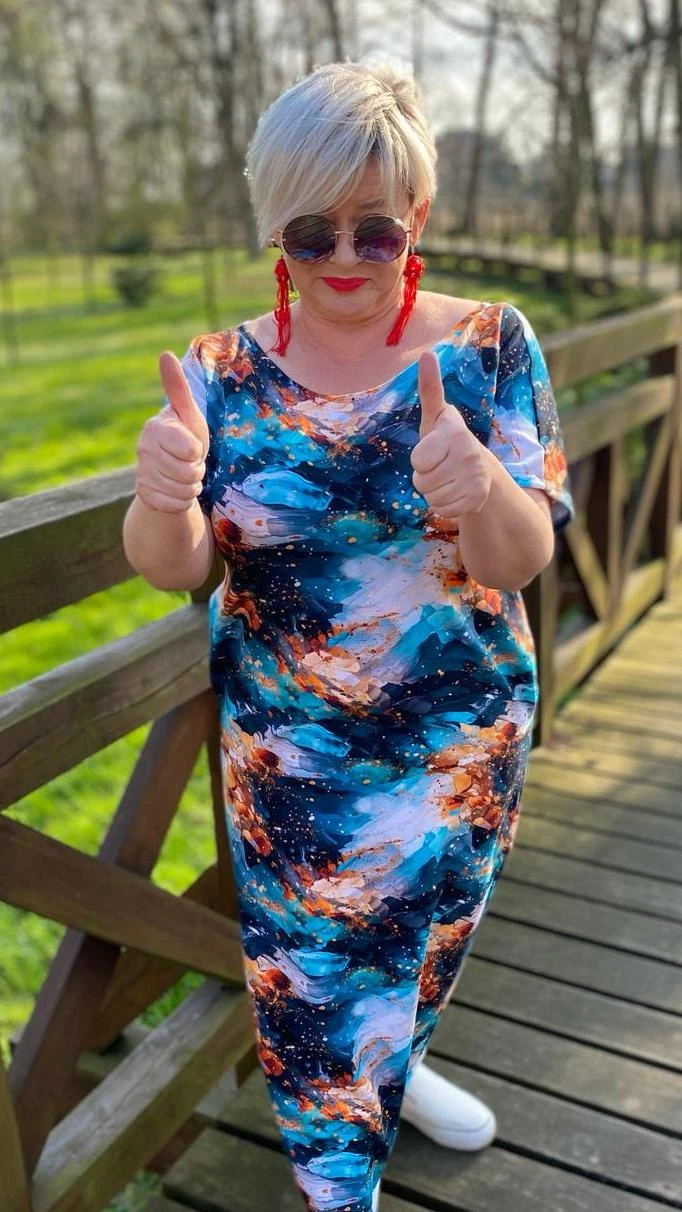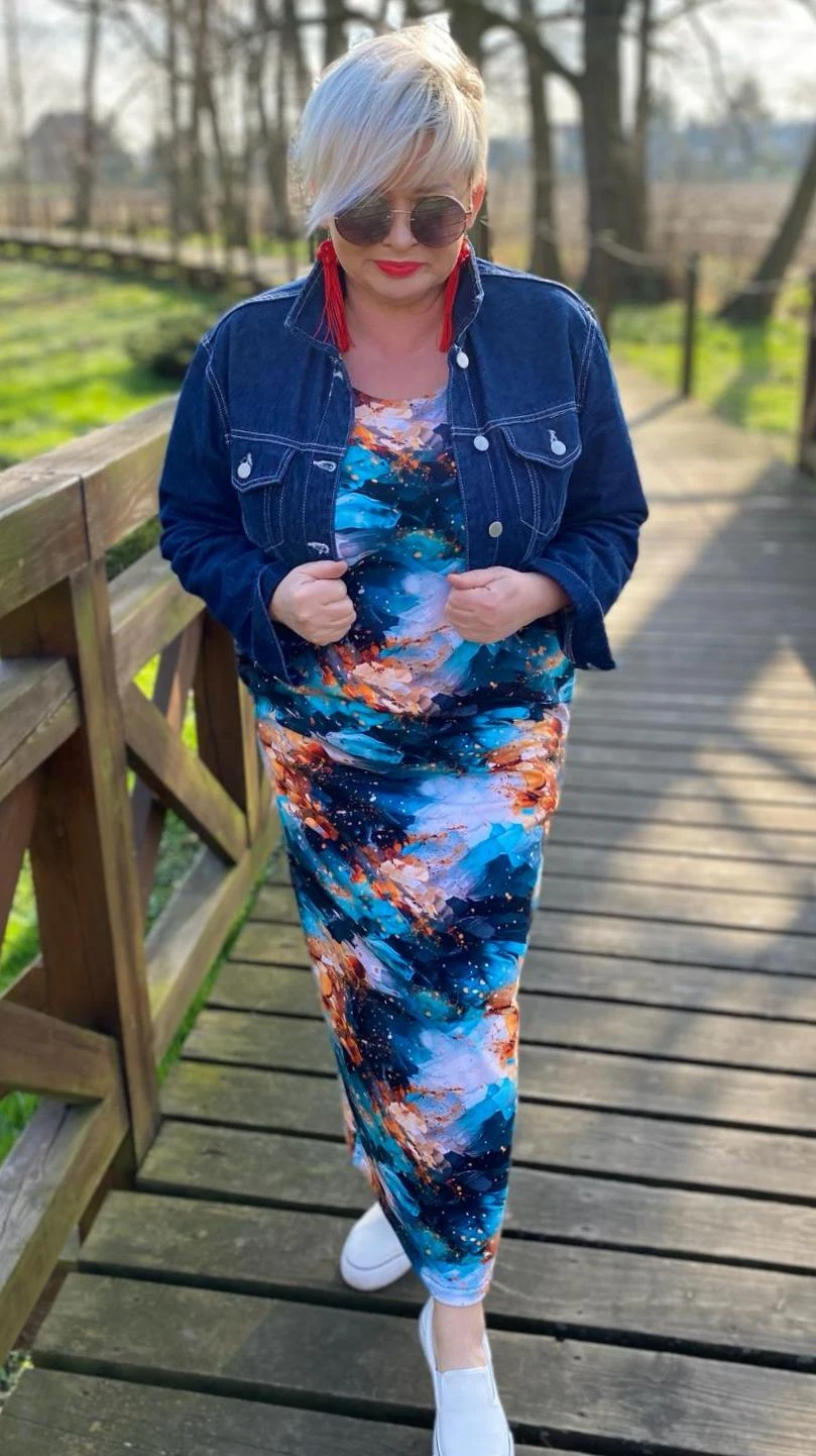 Sukienka 48/50 biust 122/124 cm, bawełniana, elastyczna, z kieszeniami, rozlana farba