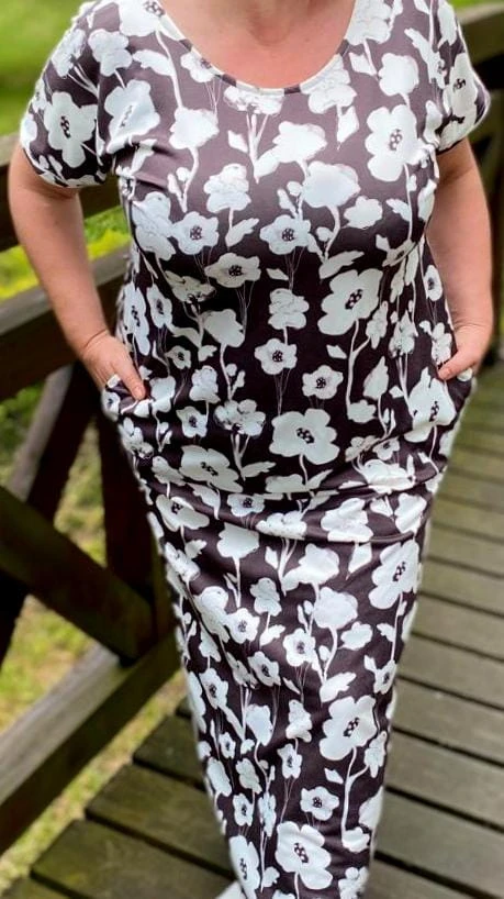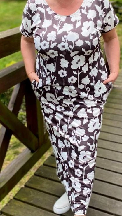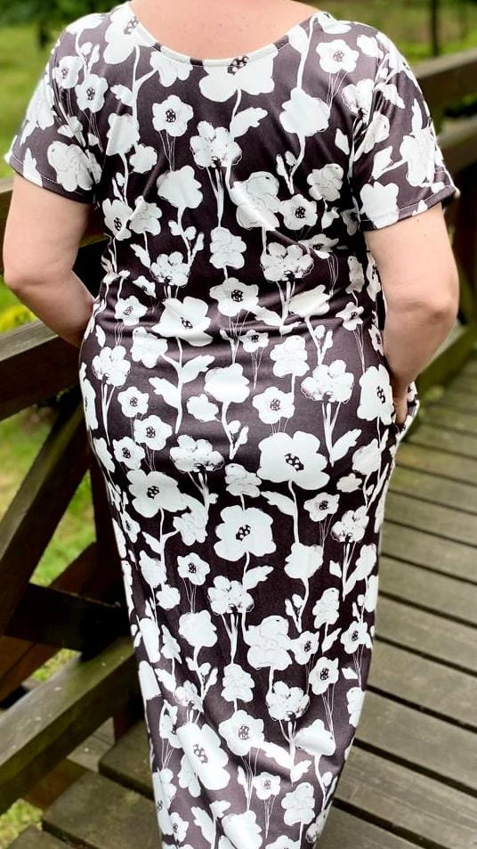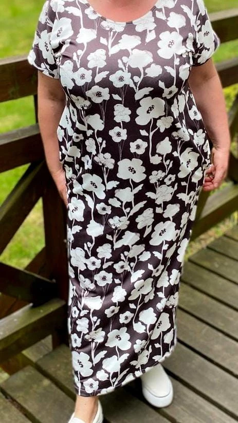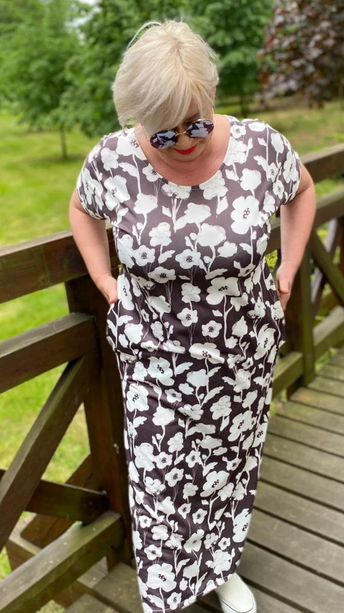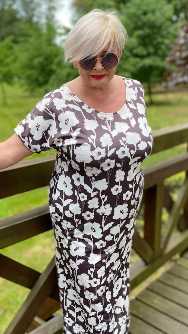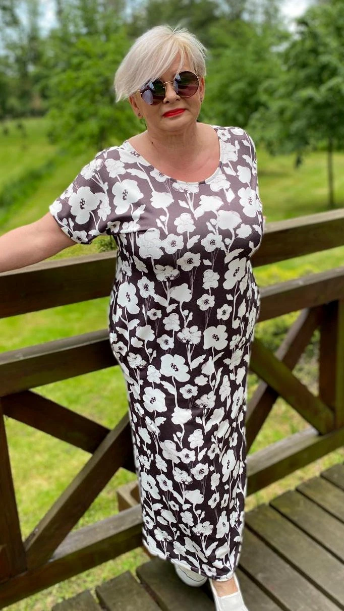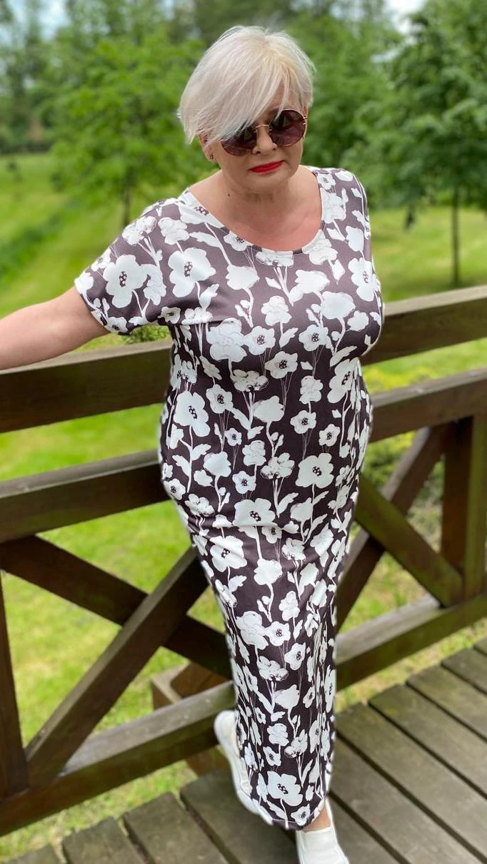 Sukienka 48/50 biust 122/124 cm, dresówka, elastyczna, 60% bawełniana, 30% poliester, 10% elastan, na duży biust, RETRO, VINTAGE, BRĄZOWA, W KREMOWE KWIATY