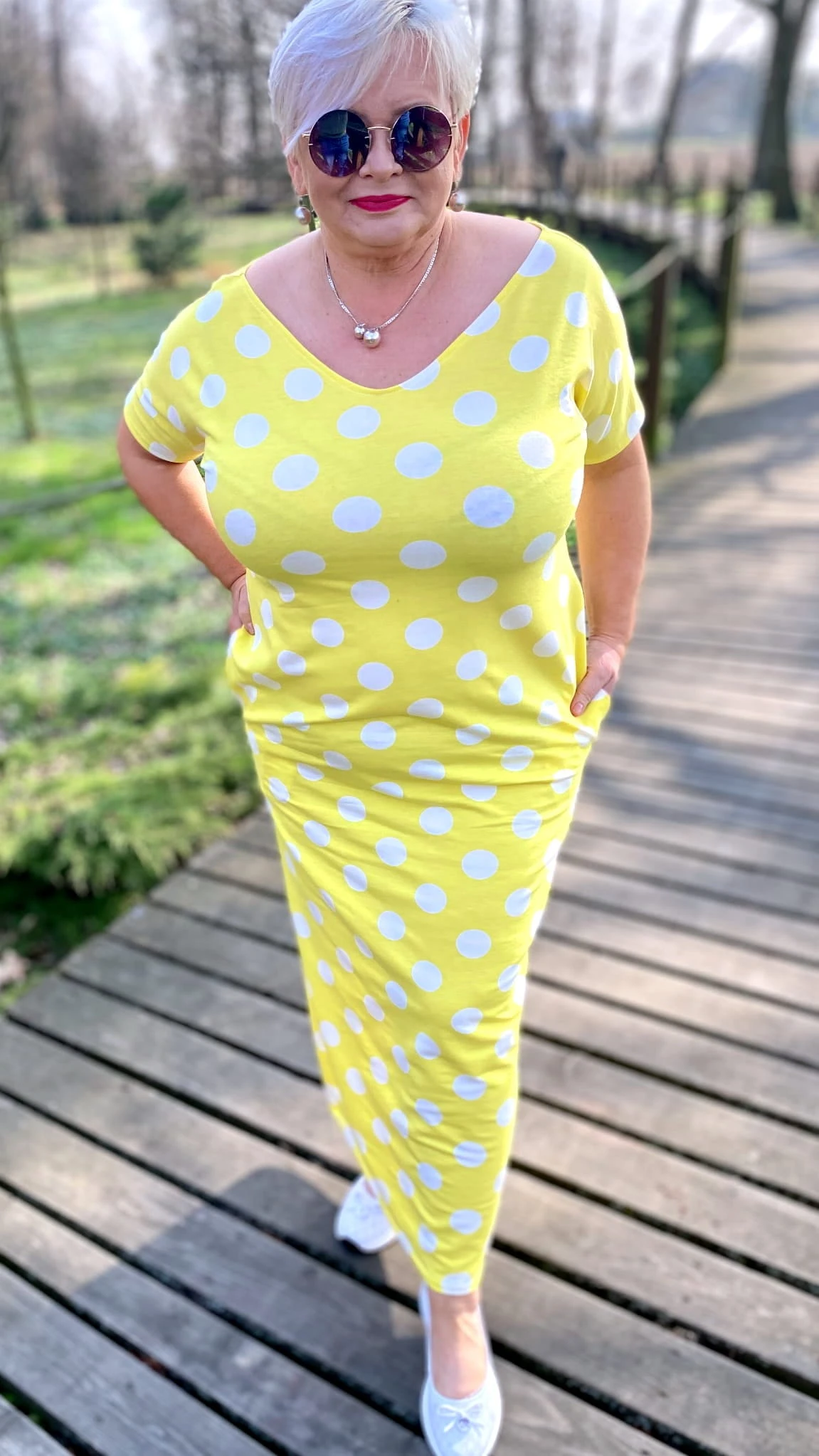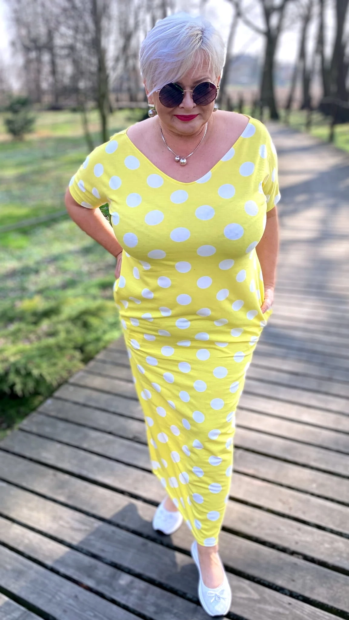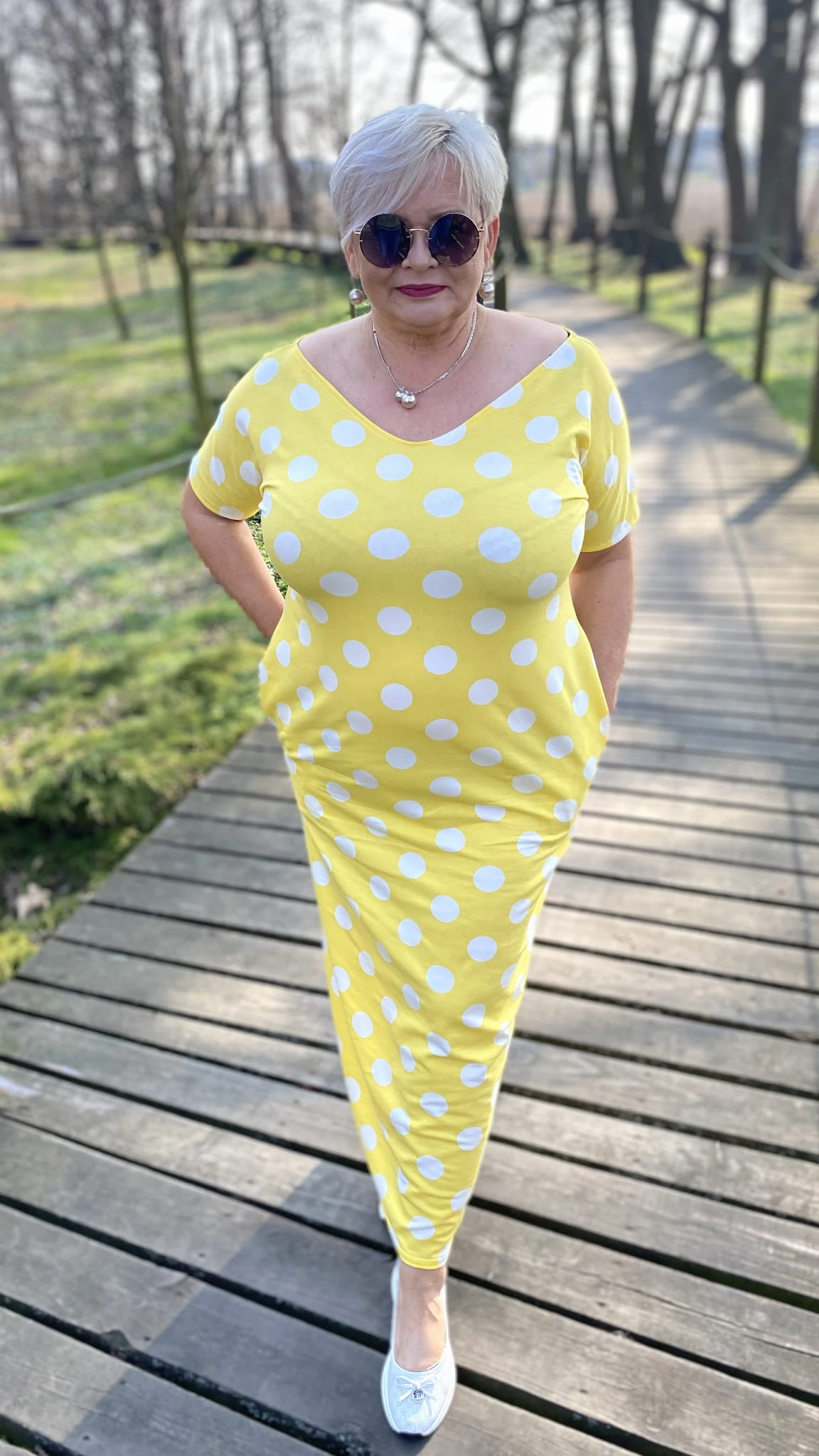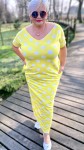 Sukienka 50/52 biust 124/126 cm, WISKOZA Z ELASTANEM, długa, prosta, z kieszeniami, WYGODNA , NA WIOSNĘ I LATO, ZÓŁTA W BIAŁE GROCHY