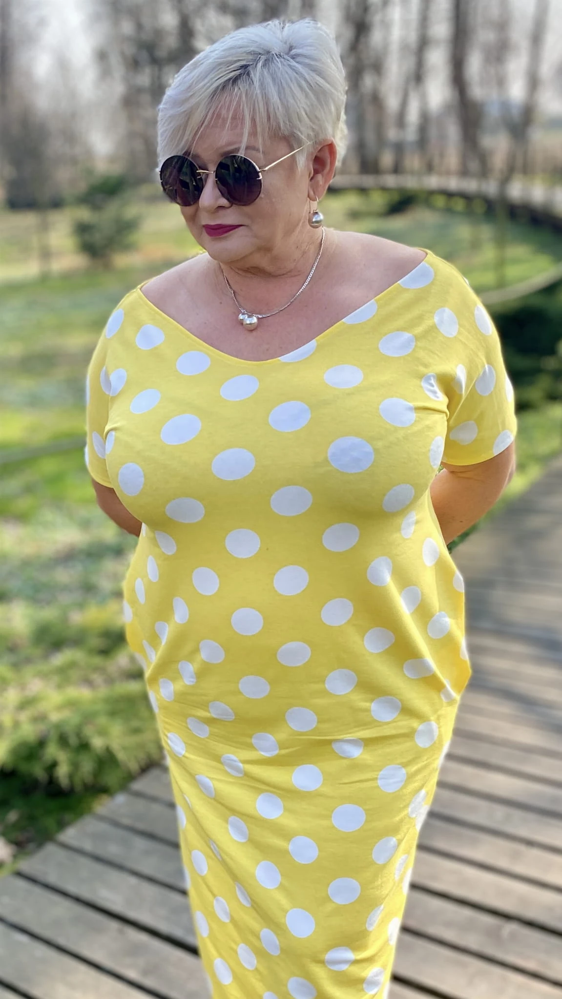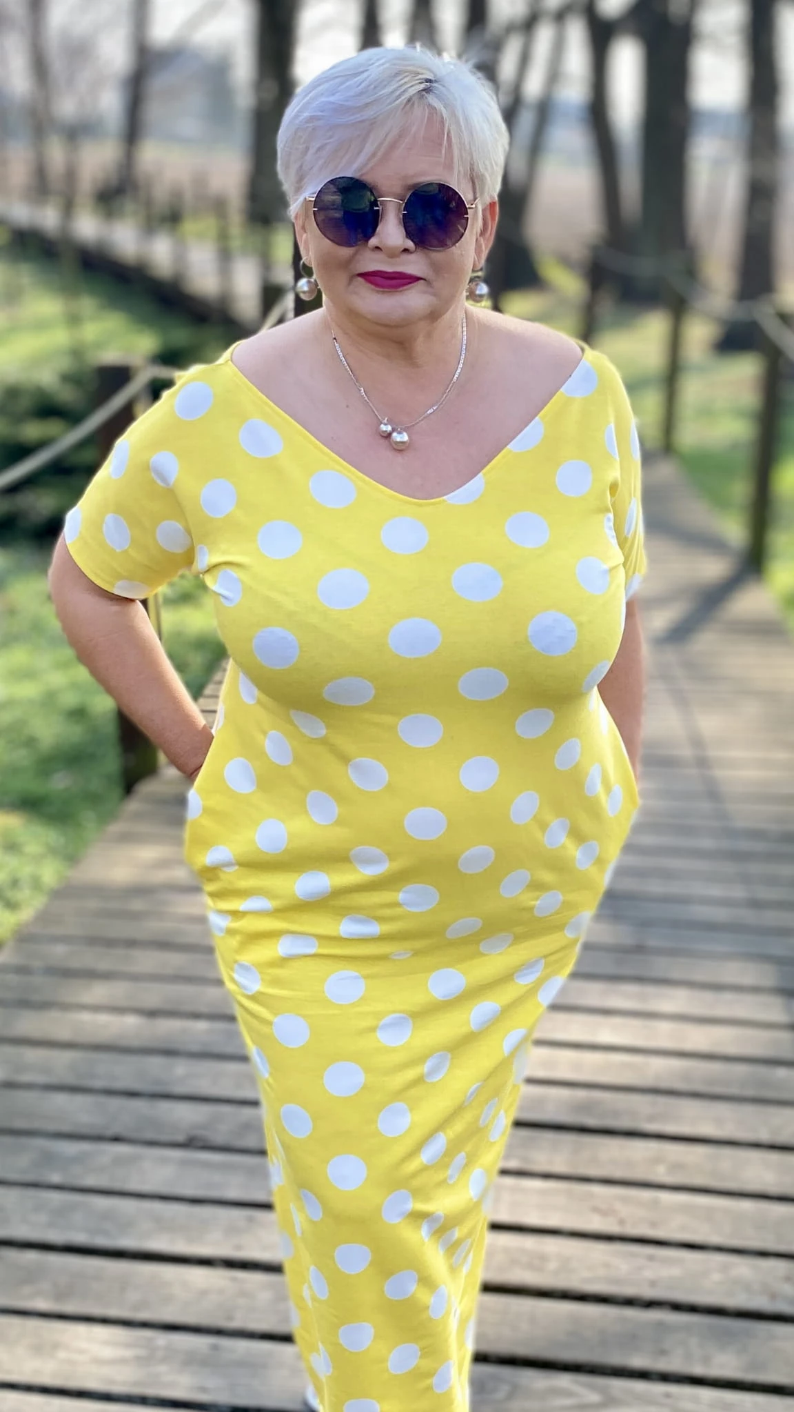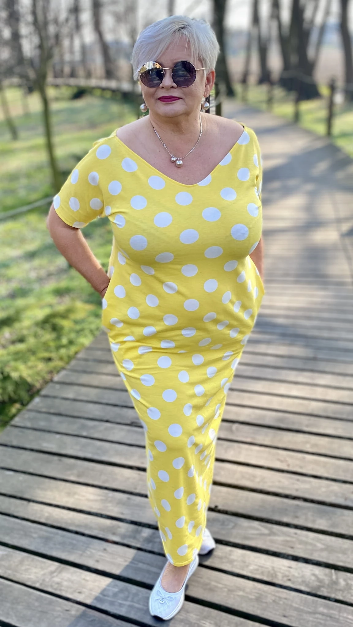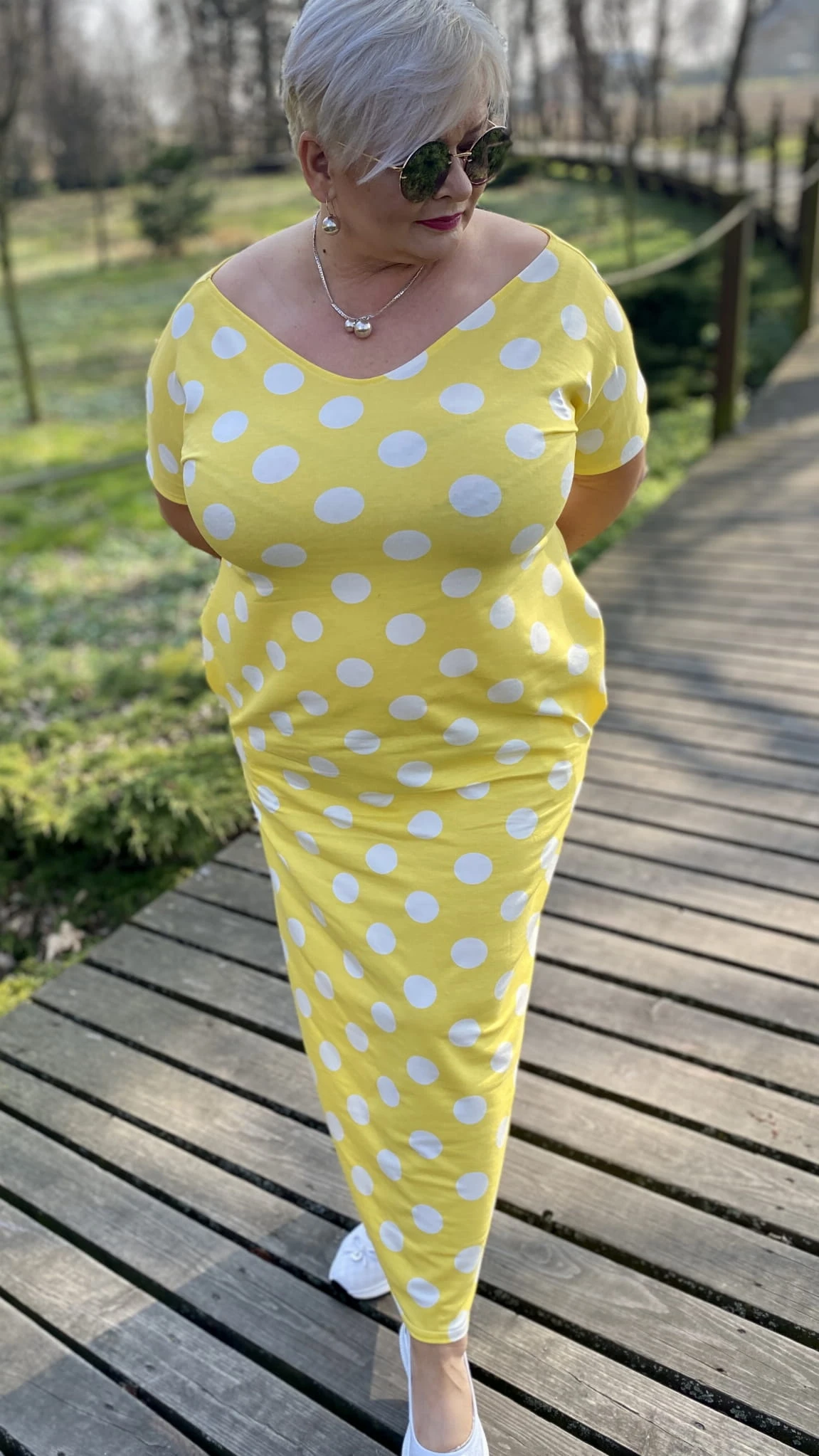 Sukienka 50/52 biust 124/126 cm, WISKOZA Z ELASTANEM, długa, prosta, z kieszeniami, WYGODNA , NA WIOSNĘ I LATO, ZÓŁTA W BIAŁE GROCHY