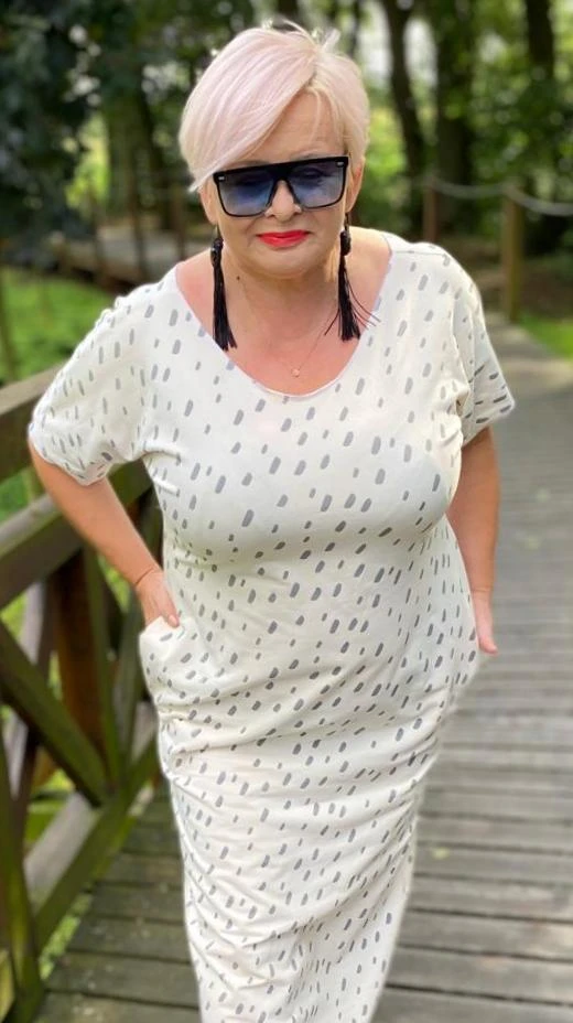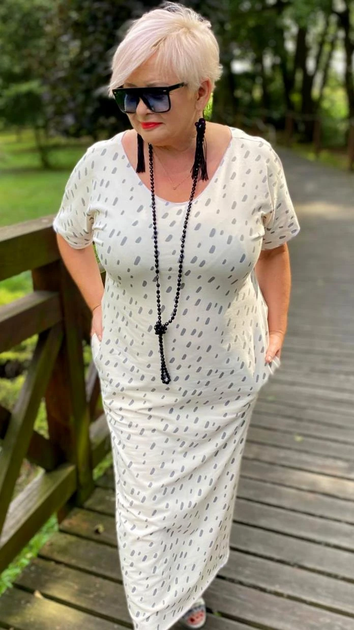 Sukienka 50/52 biust 124/126 cm plus size, na duży biust, wygodna, naturalna, całoroczna, elastyczna, bawełniana, z kieszeniami, KREMOWA, SZARE KROPLE
