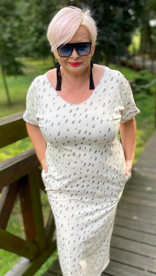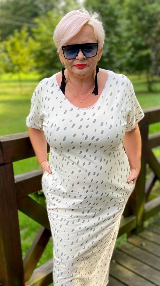 Sukienka 52/54 biust 126/128 cm plus size, na duży biust, wygodna, naturalna, całoroczna, elastyczna, bawełniana, z kieszeniami, KREMOWA, SZARE KROPLE