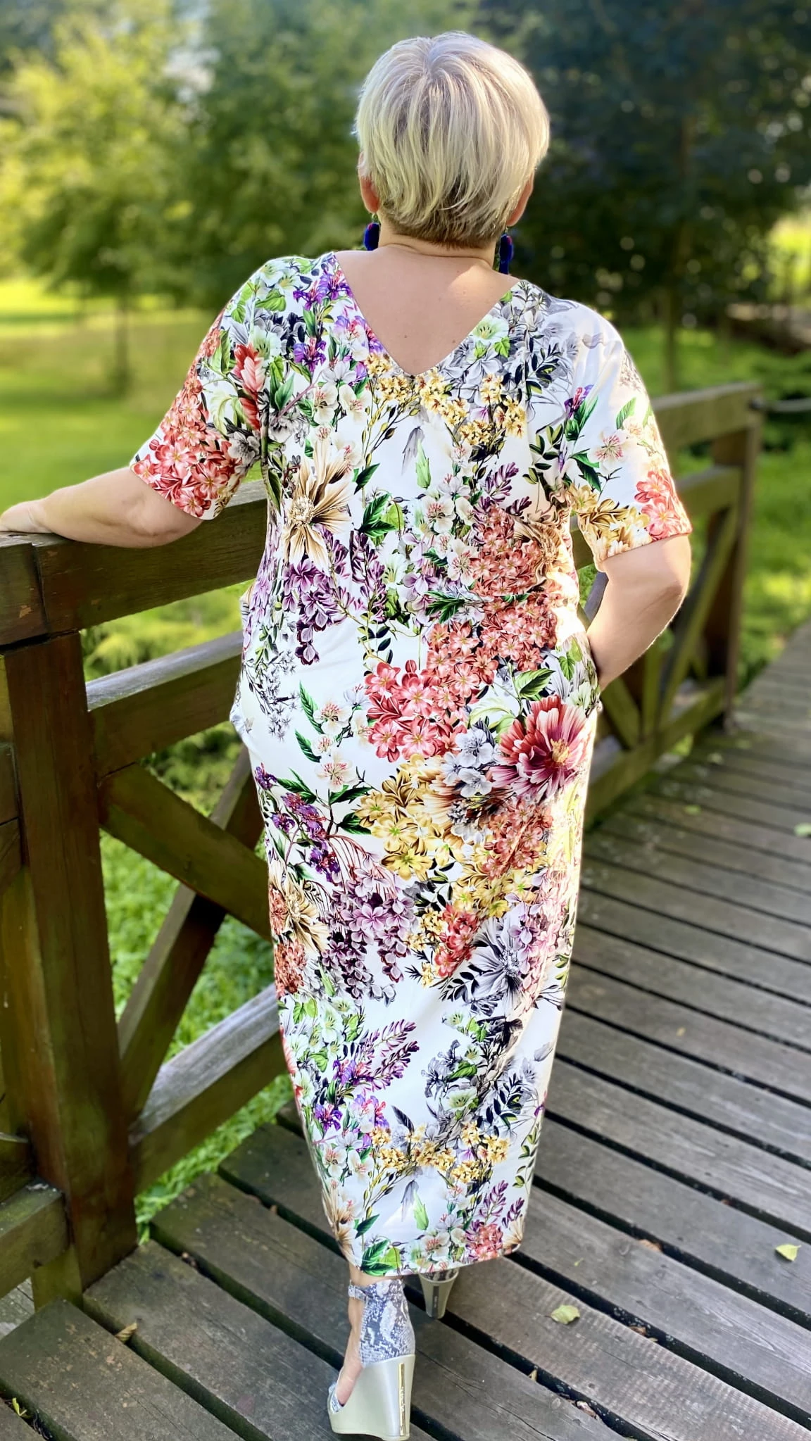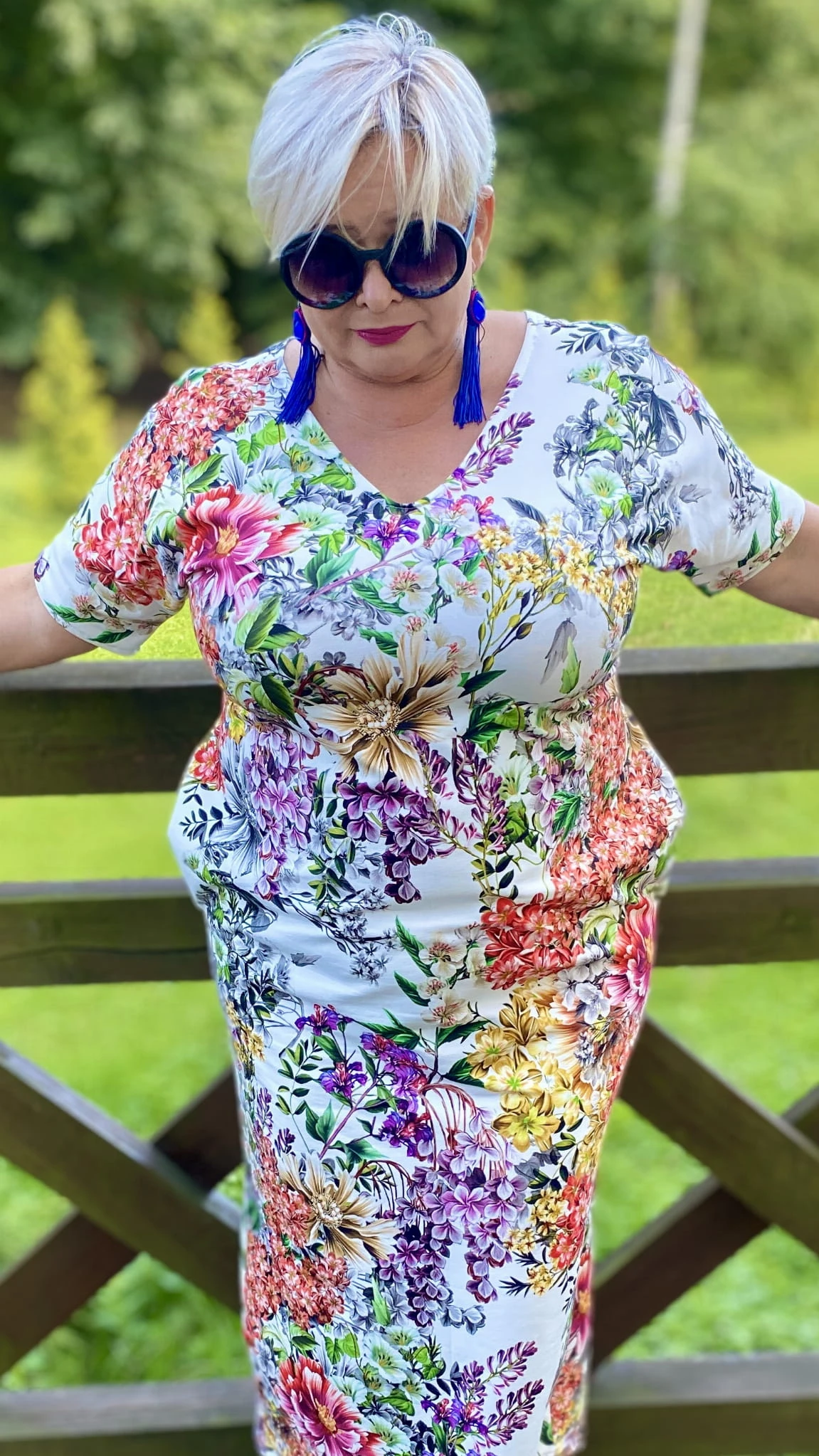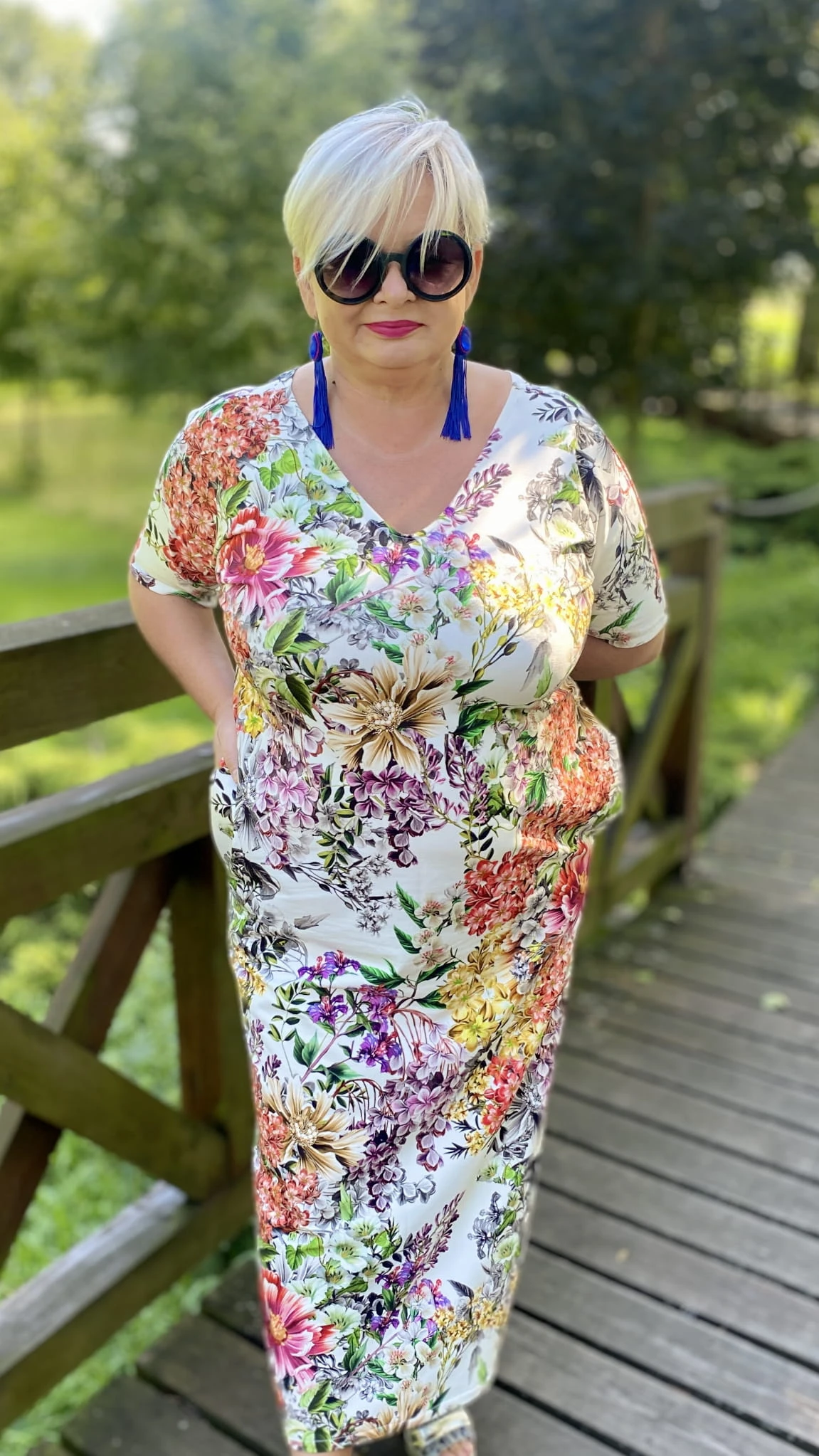 Sukienka elastyczna, całoroczna 56/58, biust 130/132 cm, z kieszeniami, bawełna 95%, fason prosty, klasyczny, idealna na większy biust, ŁĄKA KWIETNA