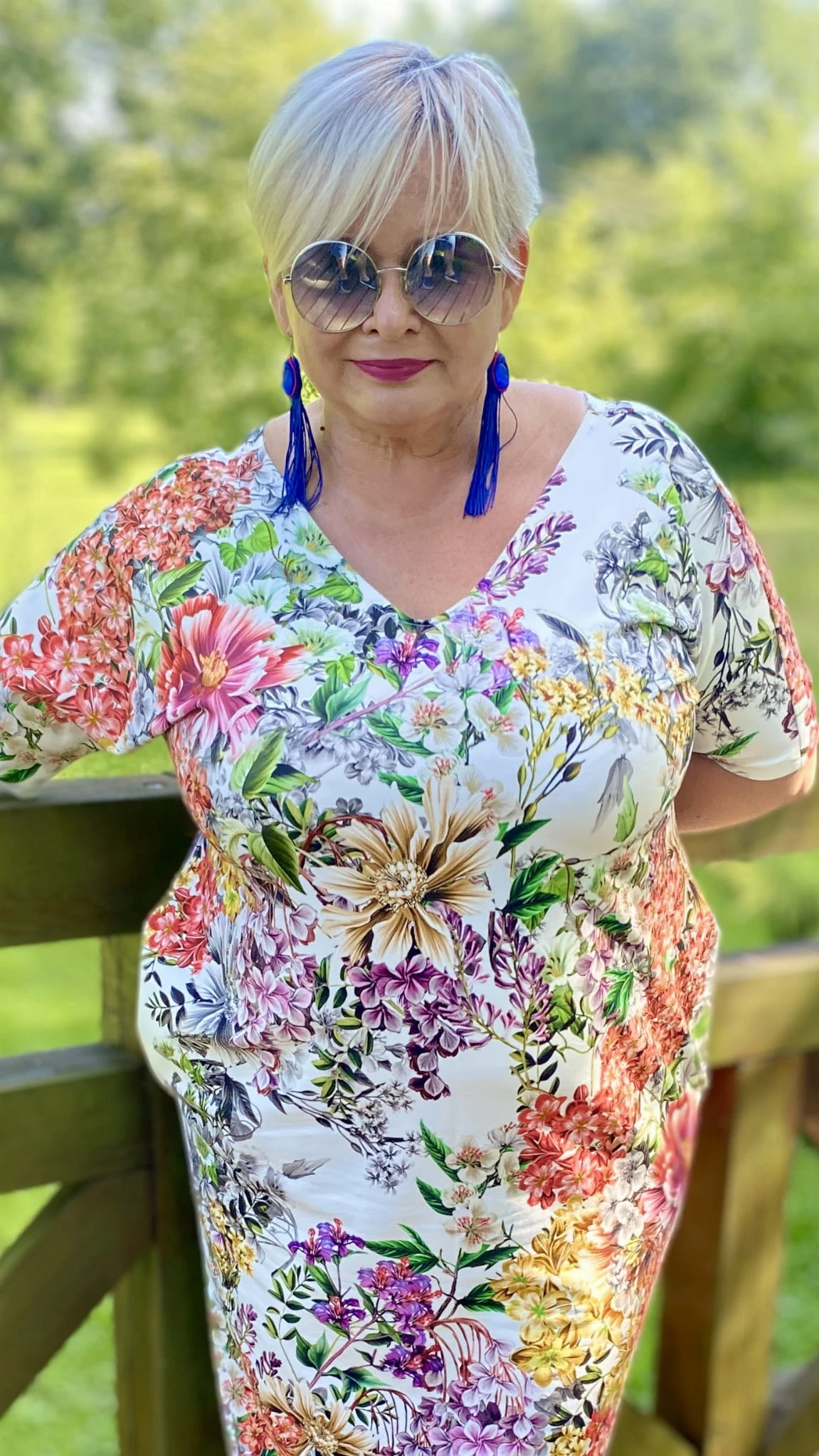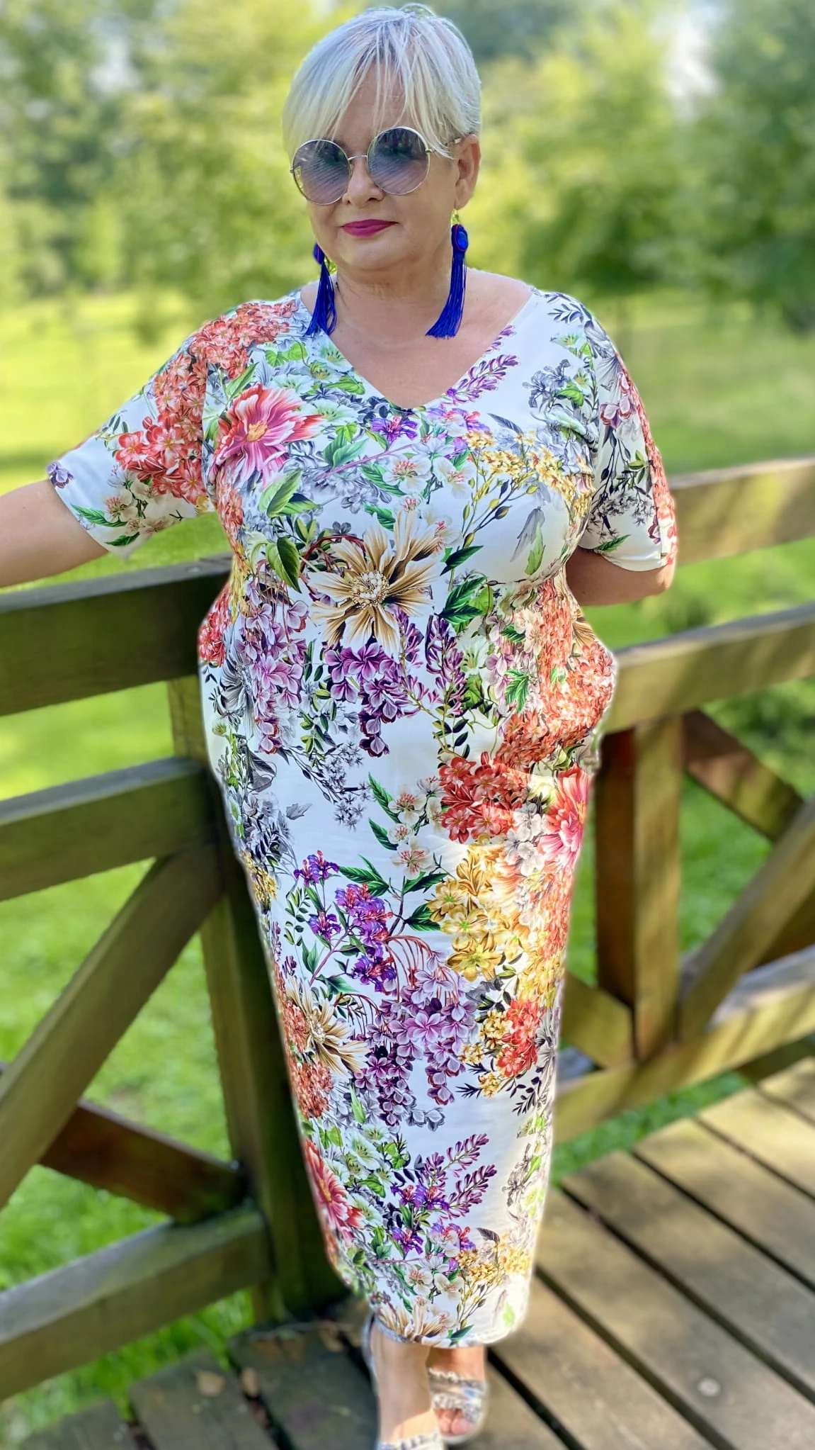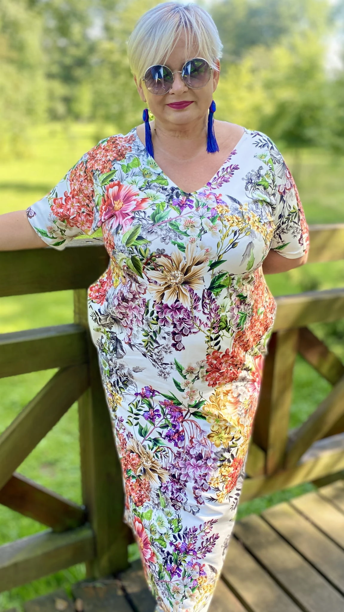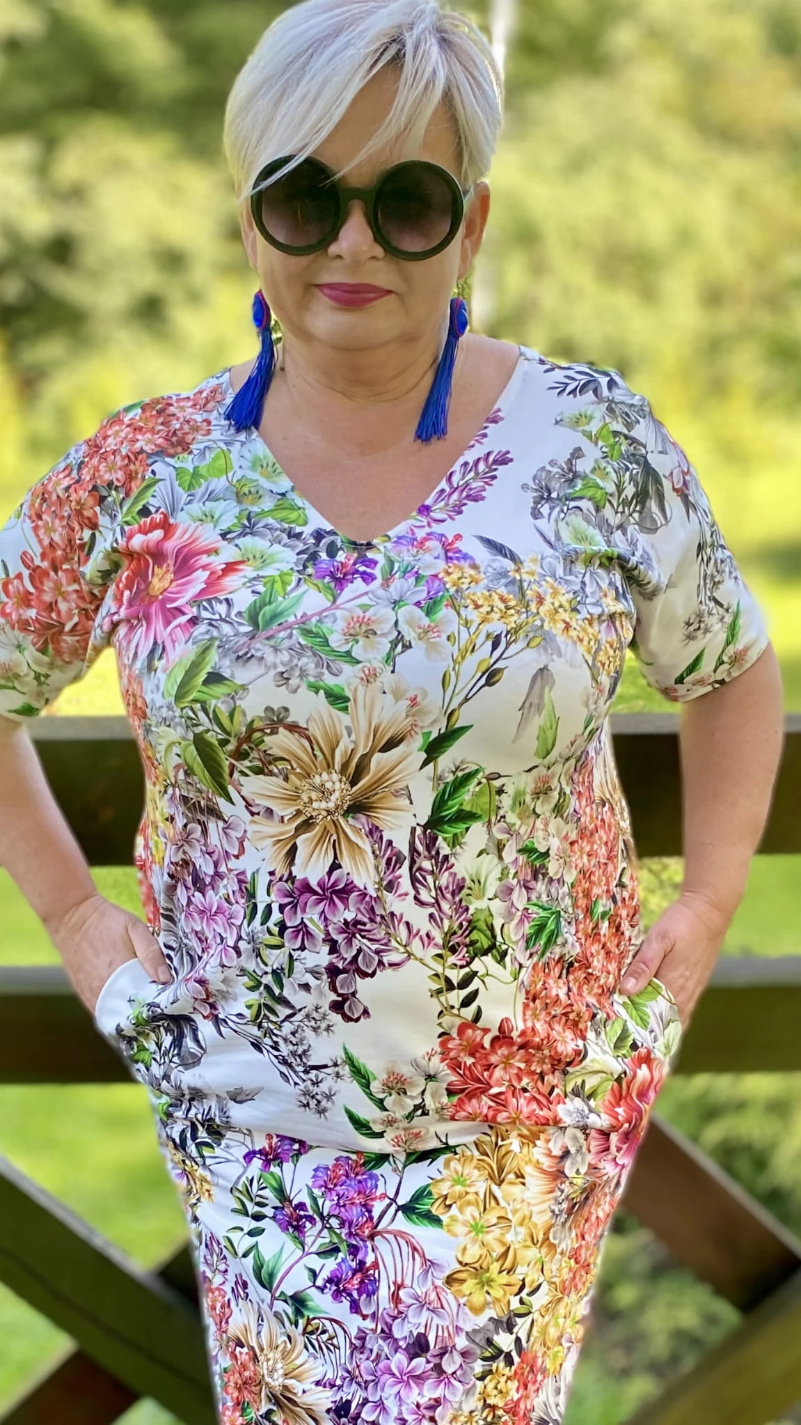 Sukienka elastyczna, całoroczna 56/58, biust 130/132 cm, z kieszeniami, bawełna 95%, fason prosty, klasyczny, idealna na większy biust, ŁĄKA KWIETNA